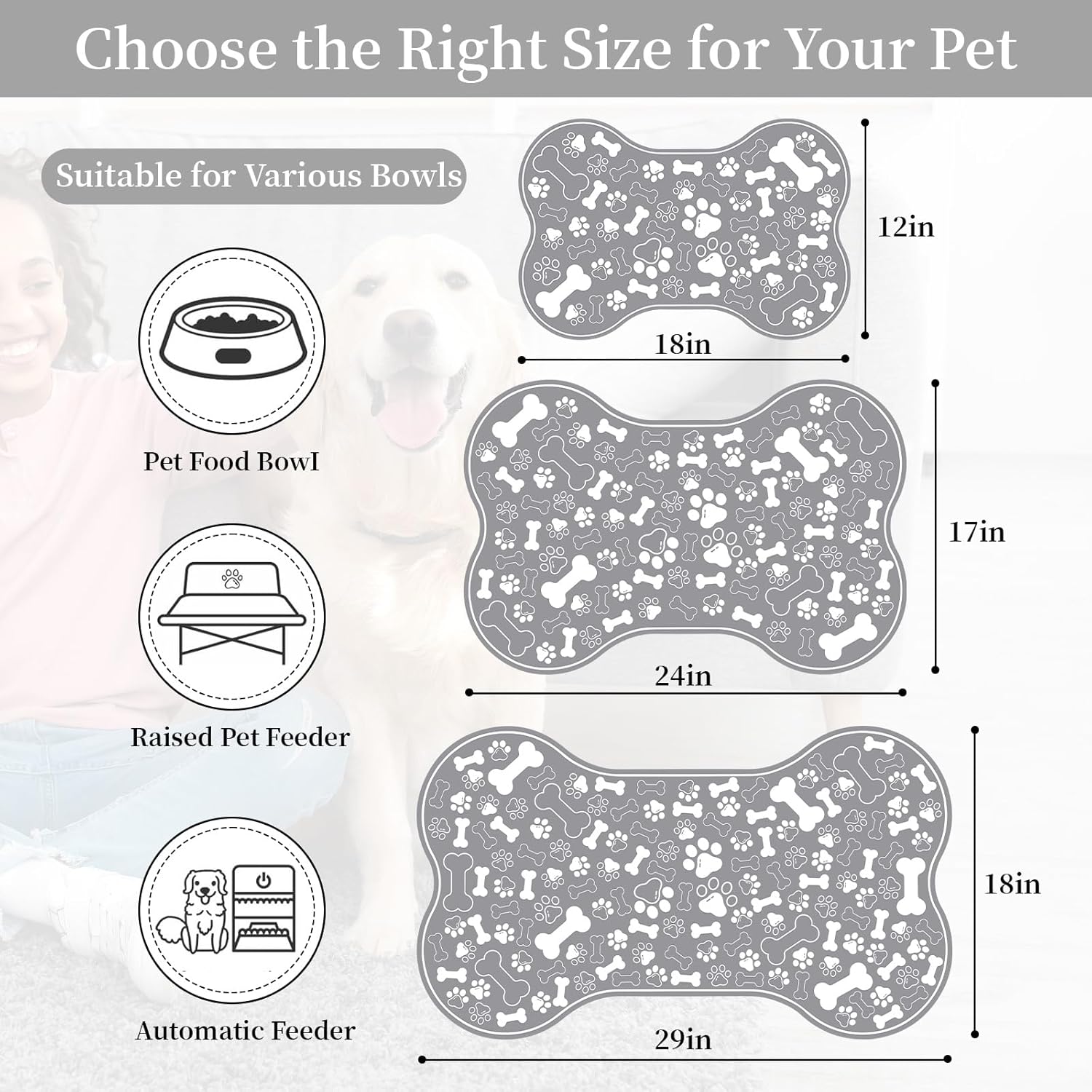 - CUTE AND FASHIONABLE DESIGN: Our pet feeding mats are designed with dog paw and bone motifs, very interesting. It is available in a variety of colors, sizes and shapes to provide a unique dedicated space for your pet's food and water bowls, and you can choose a style that matches your home décor.