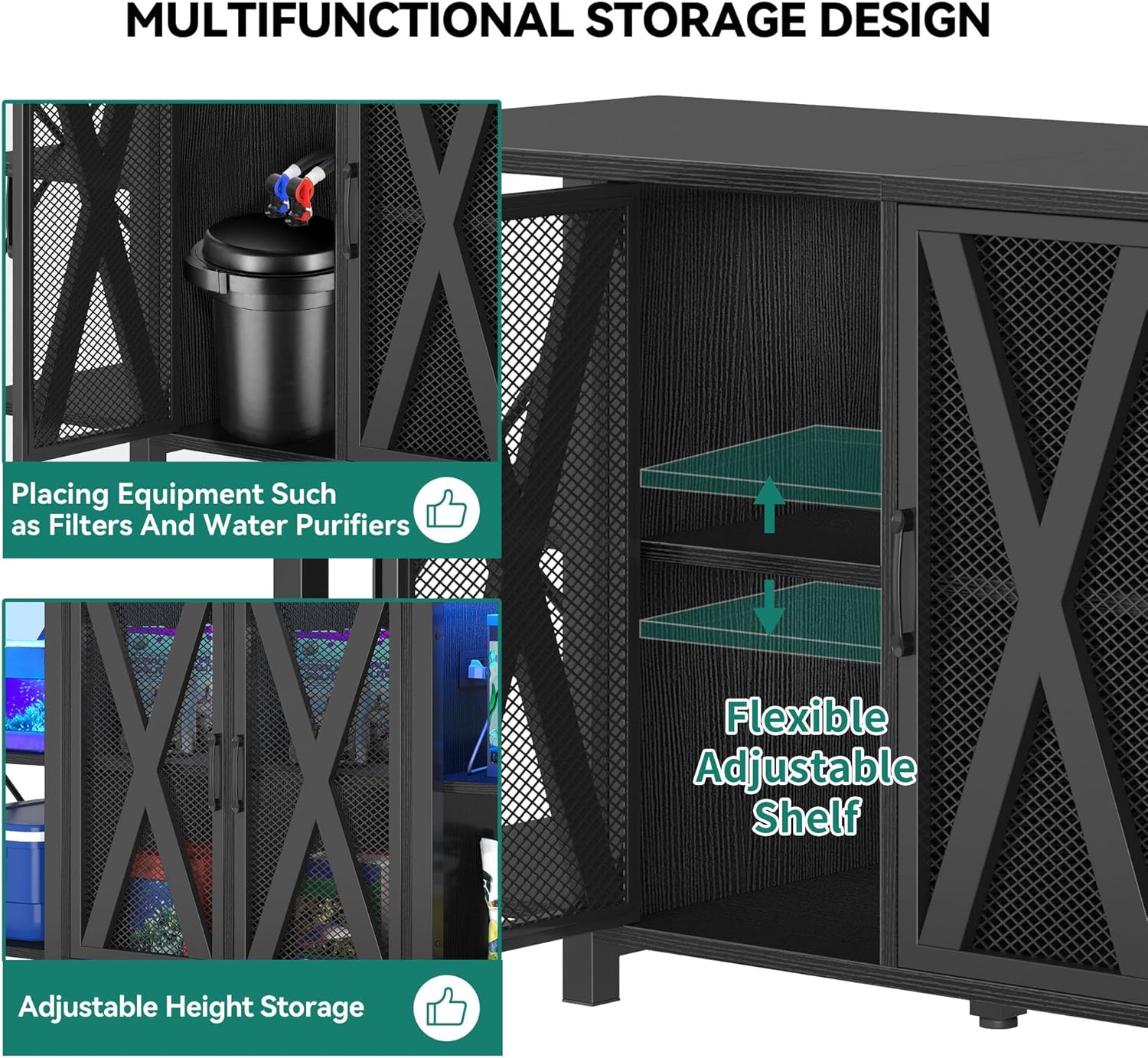 - Storage Efficiency: Maintain order with our fish tank with stand features for fish food, tools, and accessories. Adjustable shelves cater to items of all sizes, keeping your aquarium essentials in one place