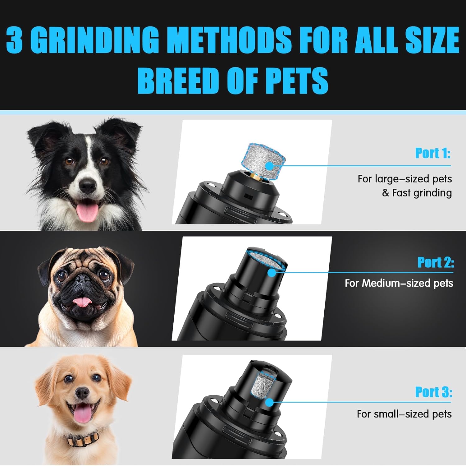 - Two Speeds & Three Grinding Ports: Effortlessly trim your pet's nails with two adjustable speeds (8,000-10,000 RPM) and three nail grinding ports. Perfect for pets of all sizes and nail hardness, this professional nail clipper set is a must-have for at-home pet grooming