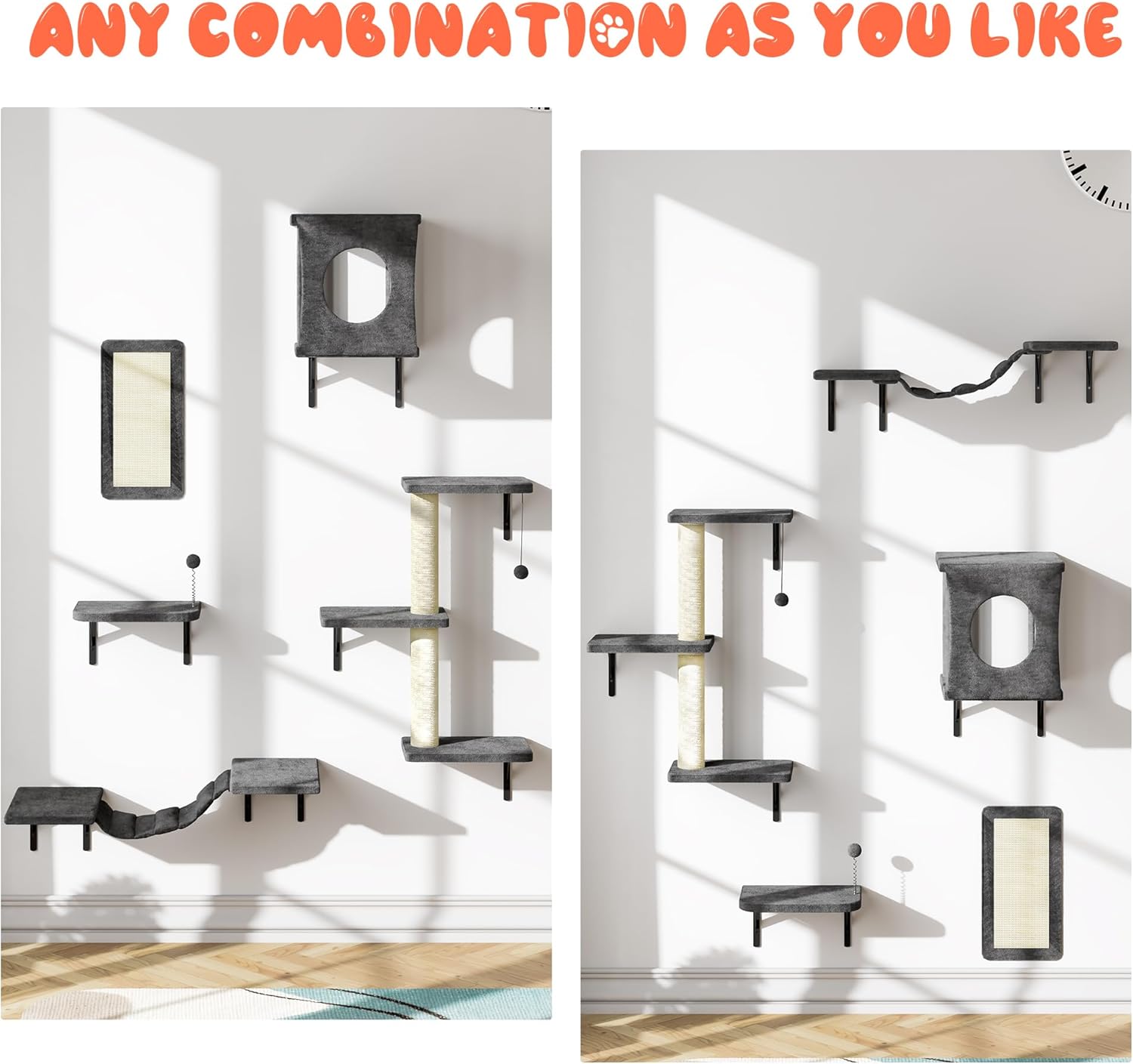 NUNU LAB Cat Wall Shelves Set, 5 Pcs Wall-Mounted Cat Climber with Cat House, Bridge, Scratching Post, Hammock, Wall Shelves, Gray