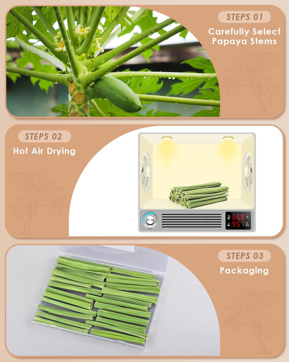 - Sealed Snack Packaging: Guinea Pigs chew sticks grow in the natural environment and are produced through the process of felling β pruning β washing β drying β sorting β packaging. When packing, choose high-quality and dry a suitable size papaya stem stick then put it in a bag to ensure Long term storage without spoilage
