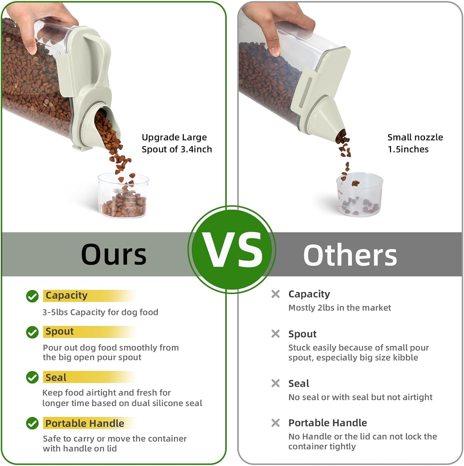 - FUNCTION : This airtight dog food container with portable handle has an airtight design,-has 2 silicone seals and 4 sealing buckles,which can keep your food dry and fresh, the portable handle and large spout design can easily Easily pours food out,also perfect for traveling, hiking, camping or picnicking with your dog
