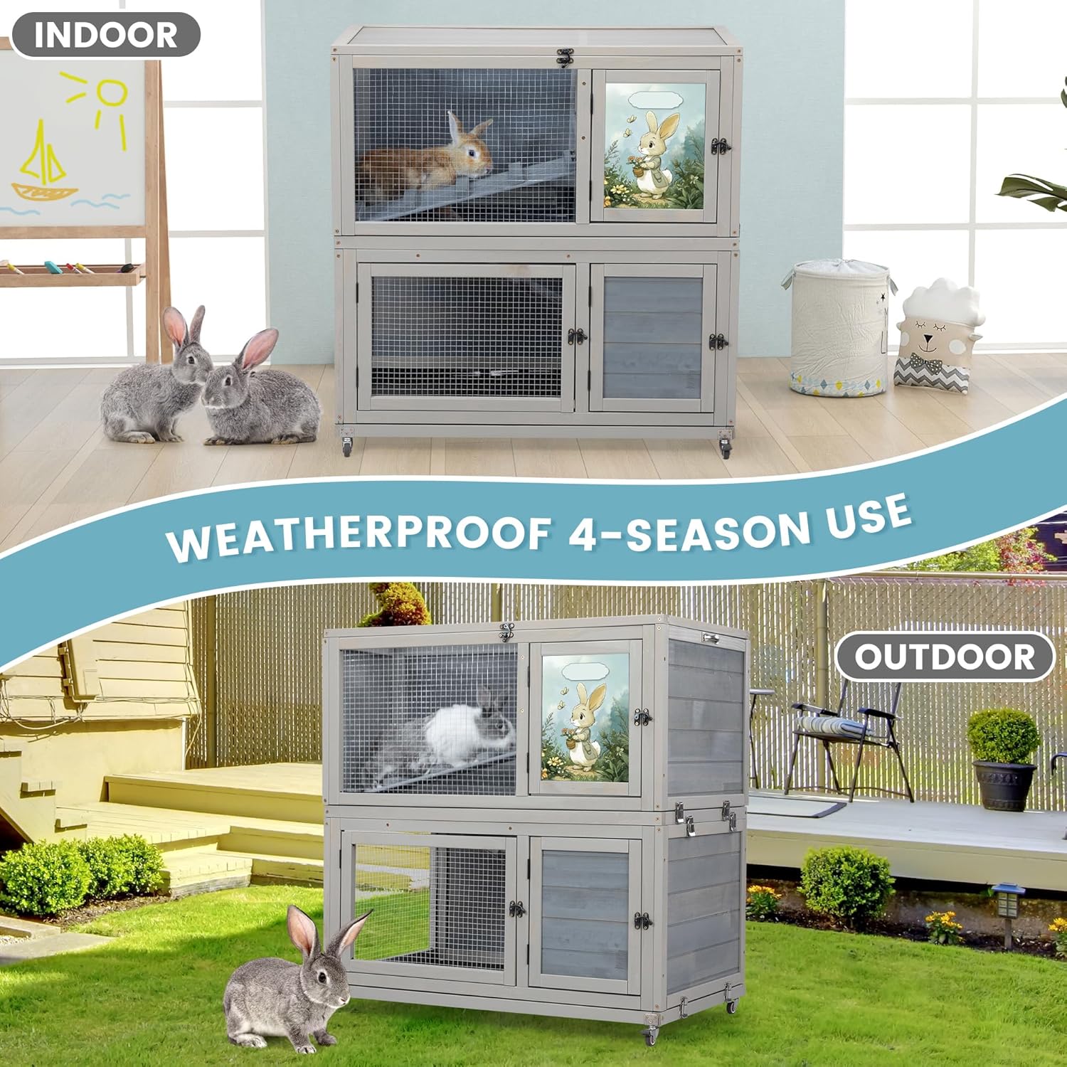 - 【Excellent Mobility】Equipped with 4 swivel wheels, this luxurious two-story Small Animal Home can be easily moved to the garden, lawn, or backyard—wherever your pet loves to be. 2 wheels feature brakes to ensure secure stopping and stable daily use.