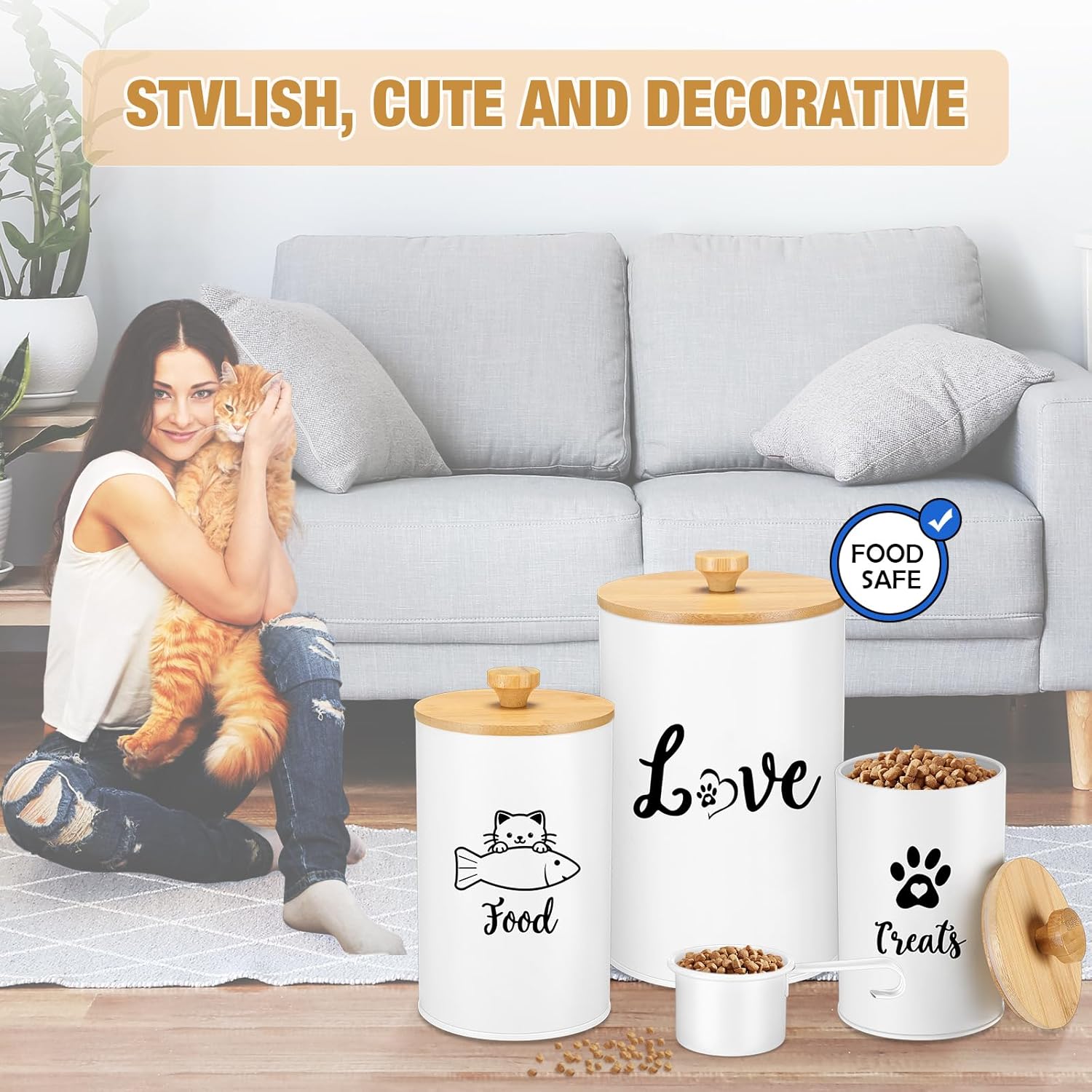 Metal Airtight Cat Treat Container Set of 3 with Bamboo Lids and Spoon Cat Food Storage Container with DIY Labels Pen Pet Cookie Snack Food Storage Organizer Jars for Kitchen Counter(White)