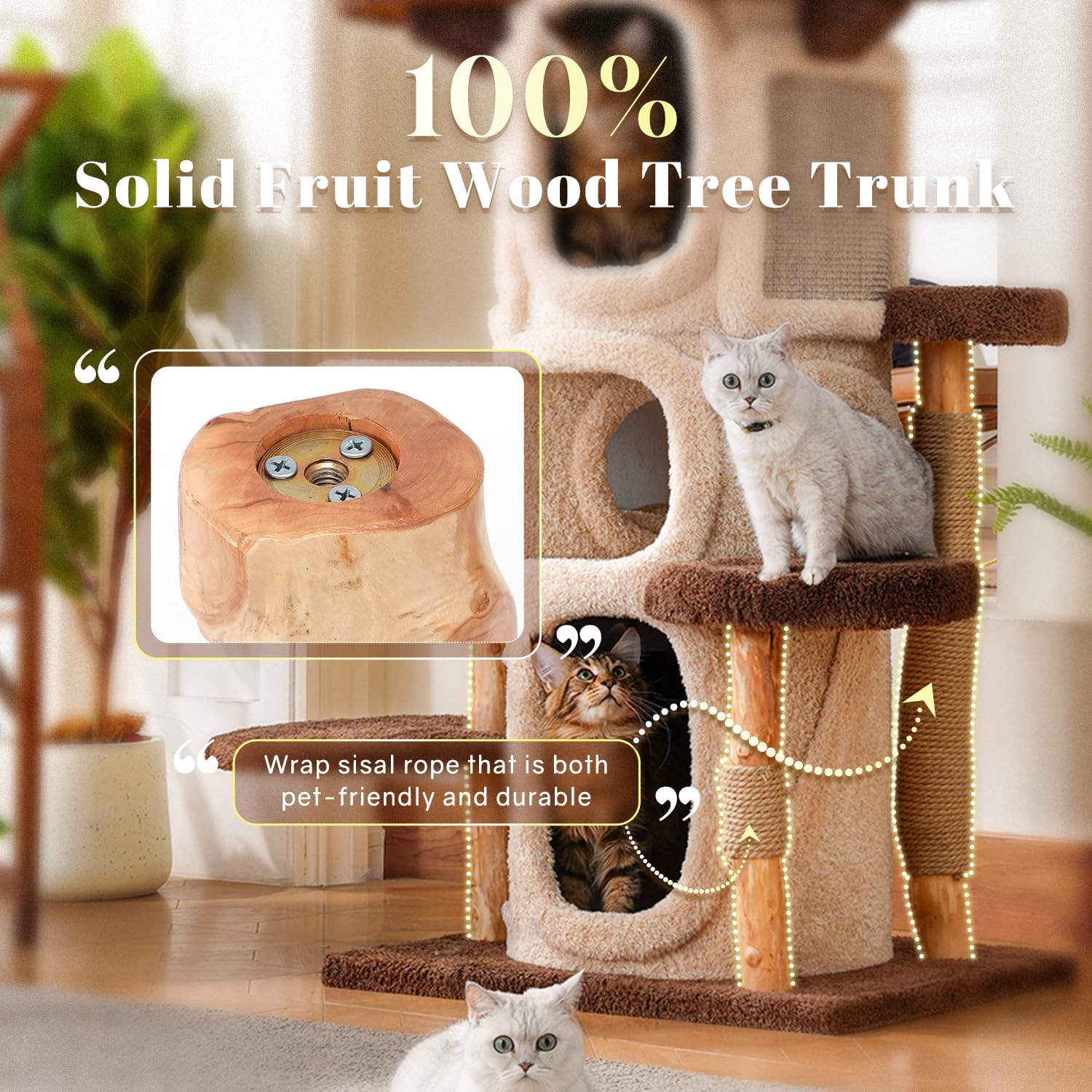 - 【Pet-friendly Material】The cat tree features hand-picked and polished branches of natural fruit wood with unique wood grain patterns. Each piece is a unique, custom-made creation. The trunk is wrapped with hand-spun natural jute, providing an ideal surface for cats to maintain their claws. This cat tower offers a healthy environment for your feline friend.