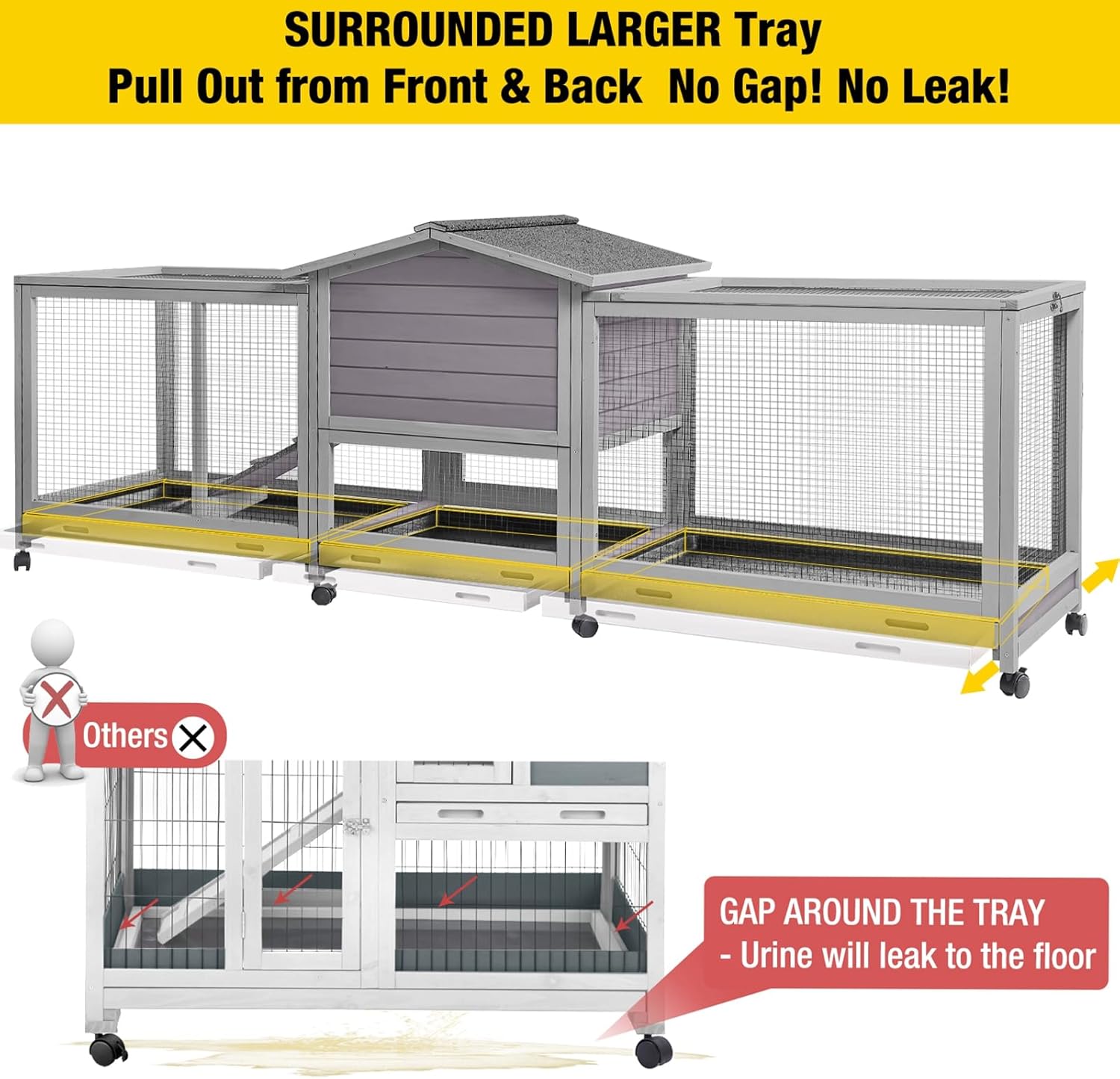- 【Leakproof Tray】The rabbit cage comes with 4 pull-out tray,the tray is made of high quality plastic,anti-odour and easy to clean,sturdy and durable,the tray will not leak or rust!The trays can be pulled out from the front or back.