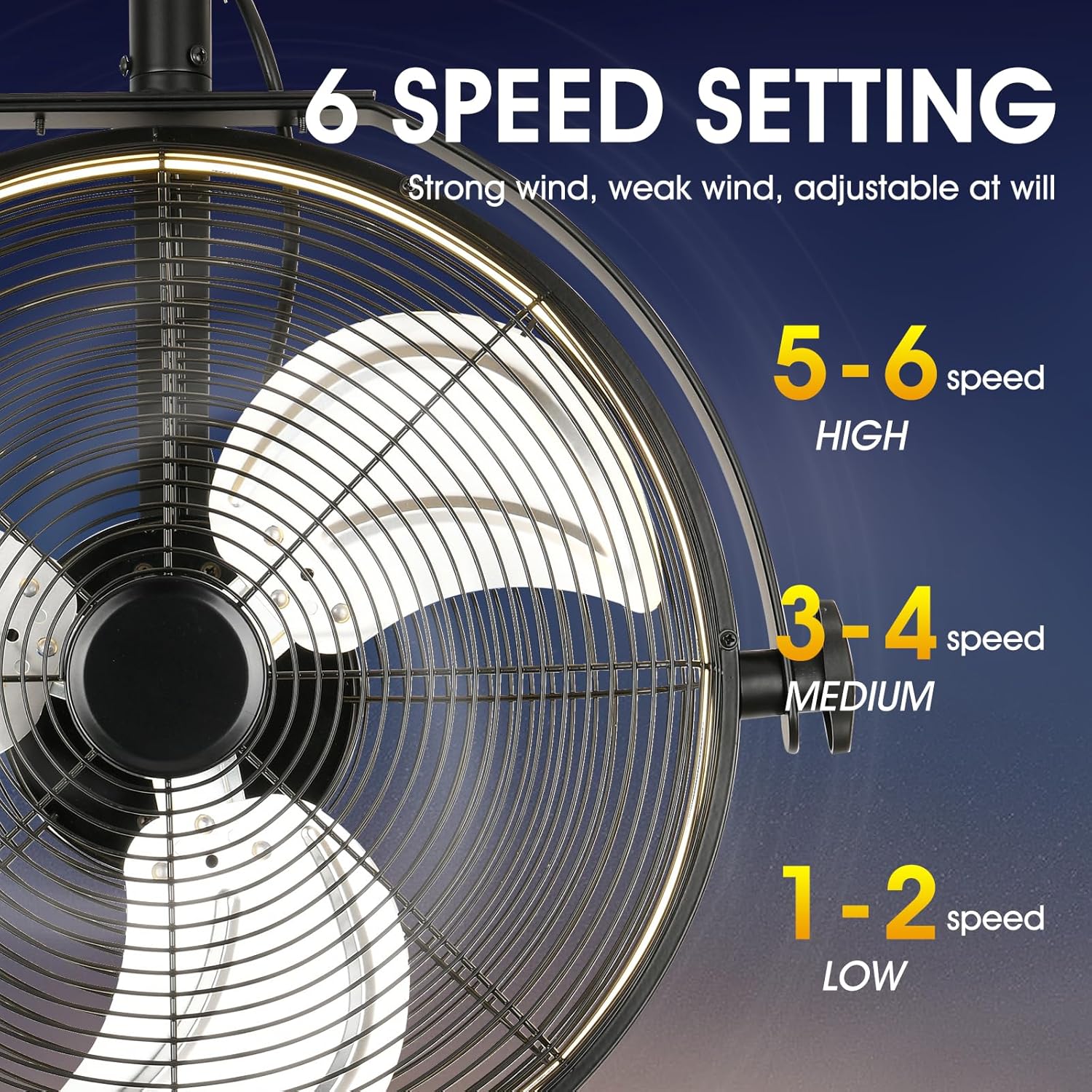 20 inch Wall Mount Fan with Lights and Remote,6-Speed Gazebo Ceiling Fan Adjustable Tilt Dimmable Wall Fan,High Velocity Industrial Outdoor Fans for Patio,Garage,Commercial,Black