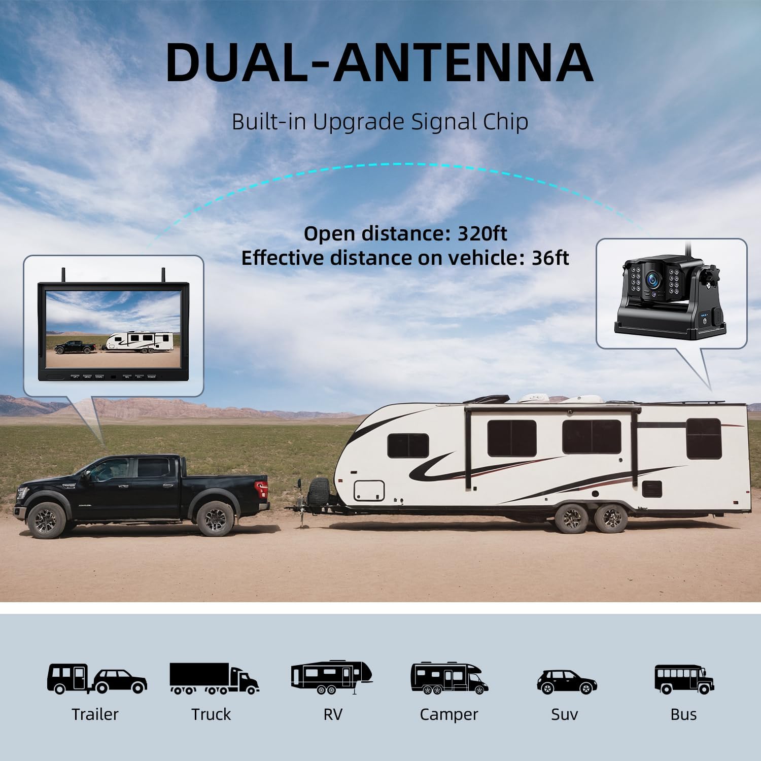 - Install-Free, Plug and Play: No wiring, no drilling. This is a totally wireless RV camera system. It's highly compatitble with RV, truck, camper, horse tailer, tractor. Secure the cameras in any metal surfaces of your vehicle to provide views you need, just turn on the cameras and plug and play the monitor