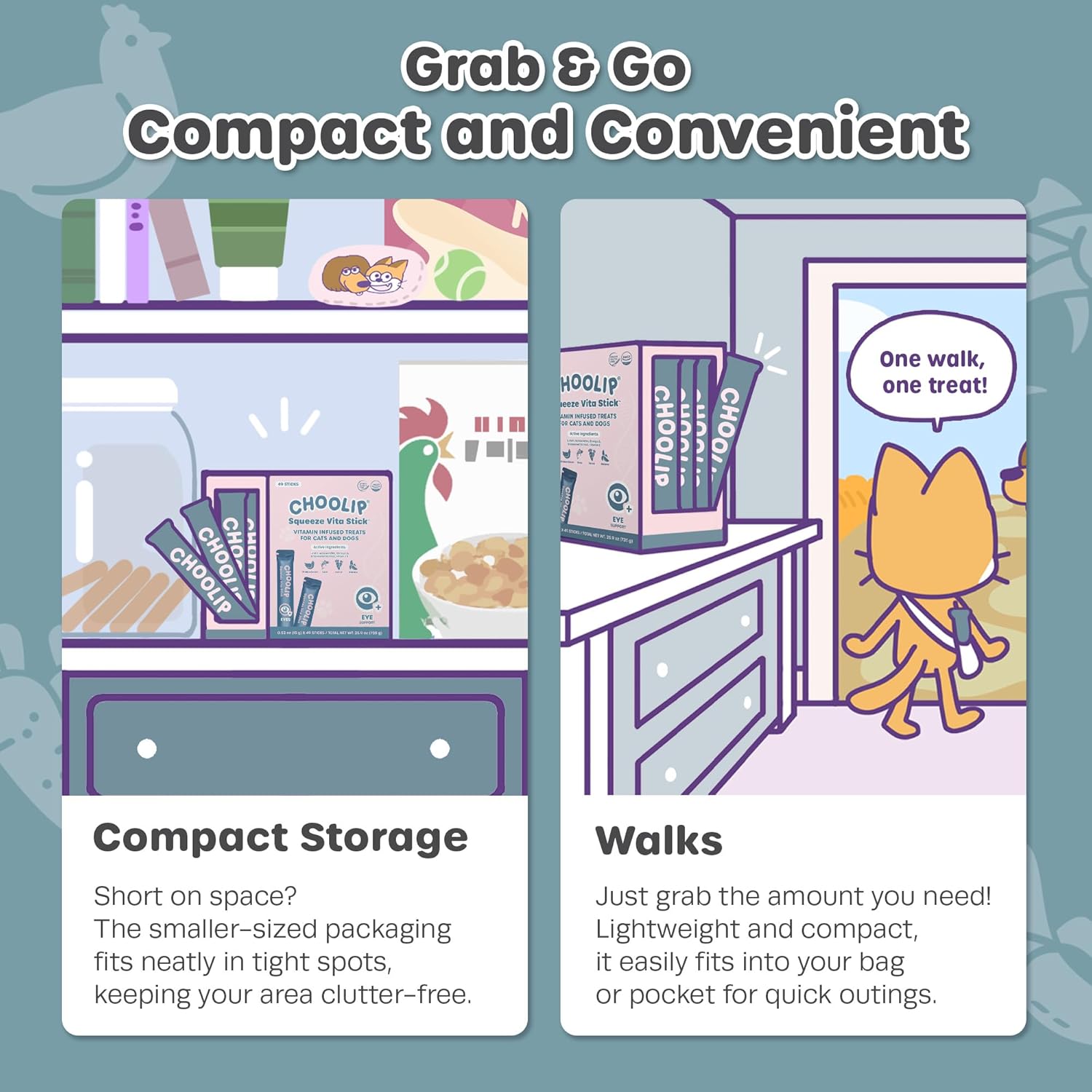 - COMPACT DISPENSER PACK: This Eye Support pack includes 49 sticks to treat your cat or dog. It’s perfect for quick, grab-and-go use, easy to carry in a bag for trips, or convenient to keep near your pet supplies.