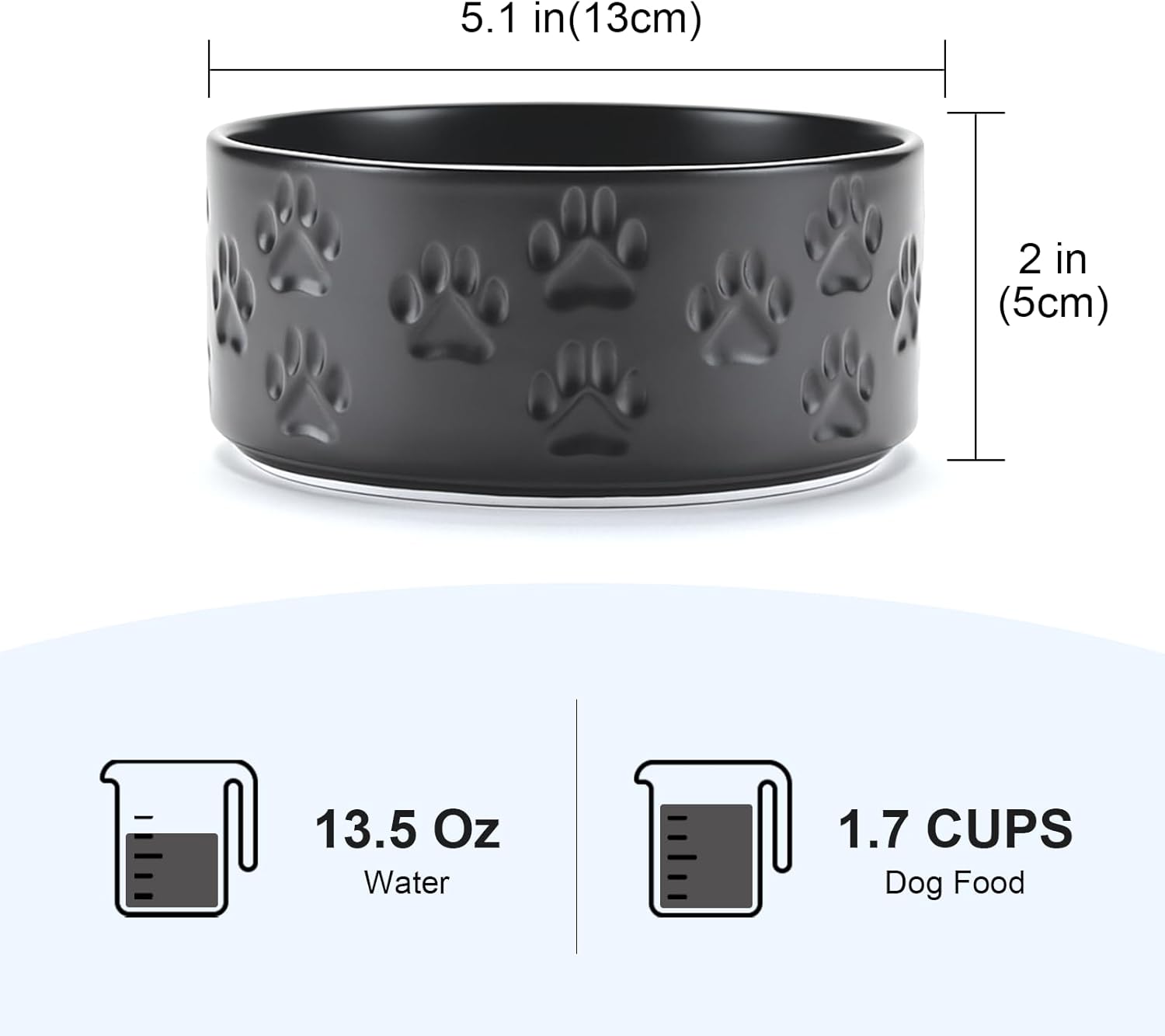 - Lead-Free Ceramic Pet Bowls - 5.1" Ceramic Dog Bowls with 13.5 OZ Capacity Fired at high temperature with a foodâgrade glaze that contains zero lead or cadmium, these nonâporous bowls help keep meals tasting fresh, rinse clean in seconds, and both MICROWAVE SAFE and DISHWASHER SAFE