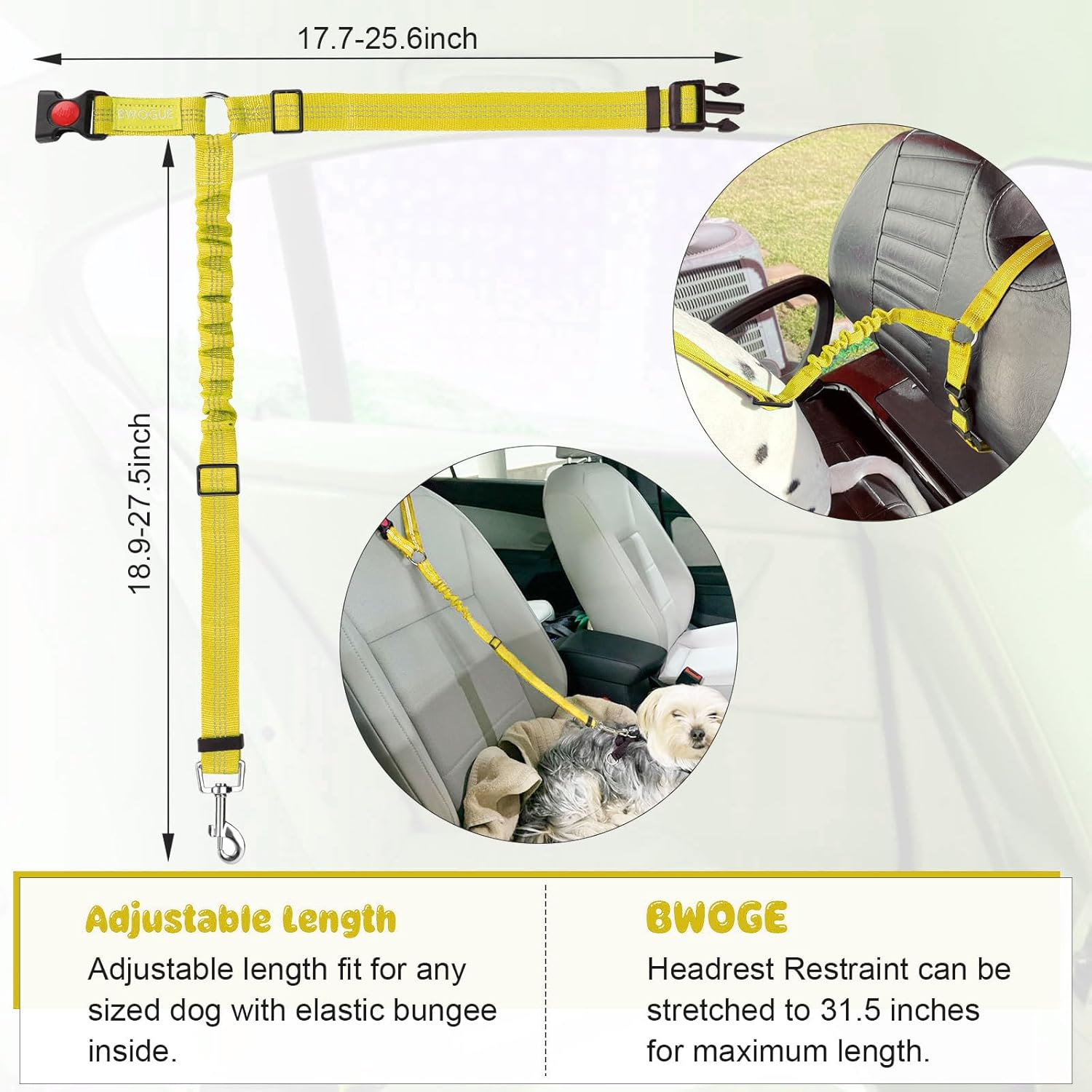 - ADJUSTABLE LENGTH: Dogs come in different sizes and weights. With buckle on the straps and the elastic bungee inside, The BWOGE Headrest Restraint is adjustable between 18.9-27.5 inches and can be stretched to 31.5 inches for the maximum length. The circle can be adjusted from 17.7 inches to 25.6 inches.You can easy to adjust the dog leash to the suitable length to keep your pet in a safety state.