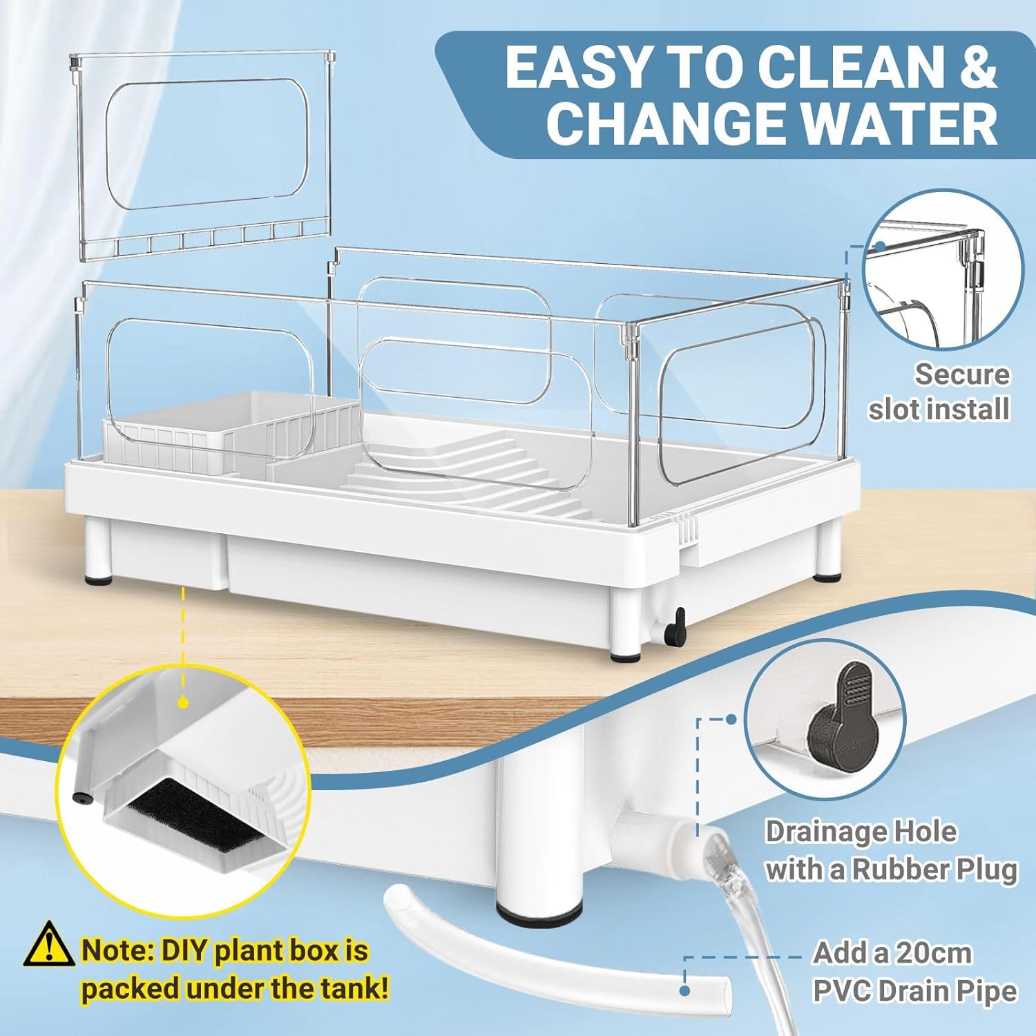 - ăEASY TO USE AND CLEANăKeep your turtle tank clean and hassle-free with bottom drainage feature. Simply drain the water, remove debris, and refill for a healthier habitat. There is a DIY plant box is packed under the tank, you can use our included colored stones and trees to decor the landscape of the turtle aquarium.