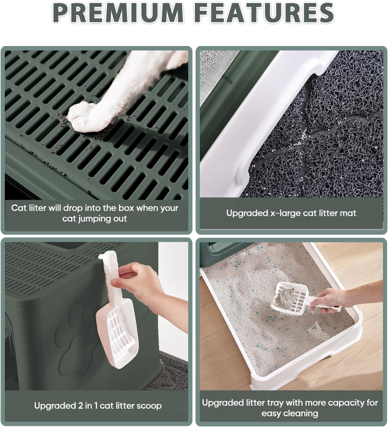 Cat Litter Box with X-Large Litter Mat and Scoop, Large Foldable Litter Box with Lid, Enclosed Kitty Box,Front Top Entry Exit, Odor Control Easy to Clean (Upgrade Olive Green)
