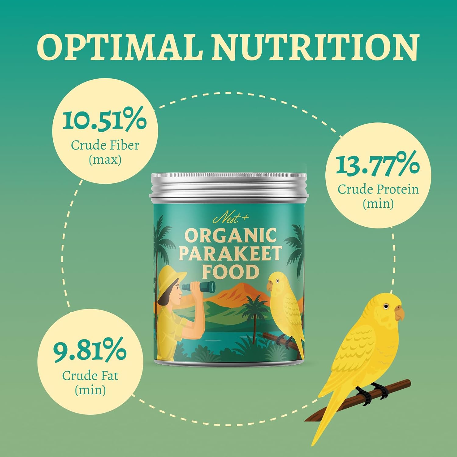 100% Organic Parakeet Food – Premium Bird Seed Mix with Oat Groats, Buckwheat, Amaranth, Super Veggies & Seeds – Reusable Tin + Stainless-Steel Scooper – Made in USA, Human Grade Ingredients (1lb)