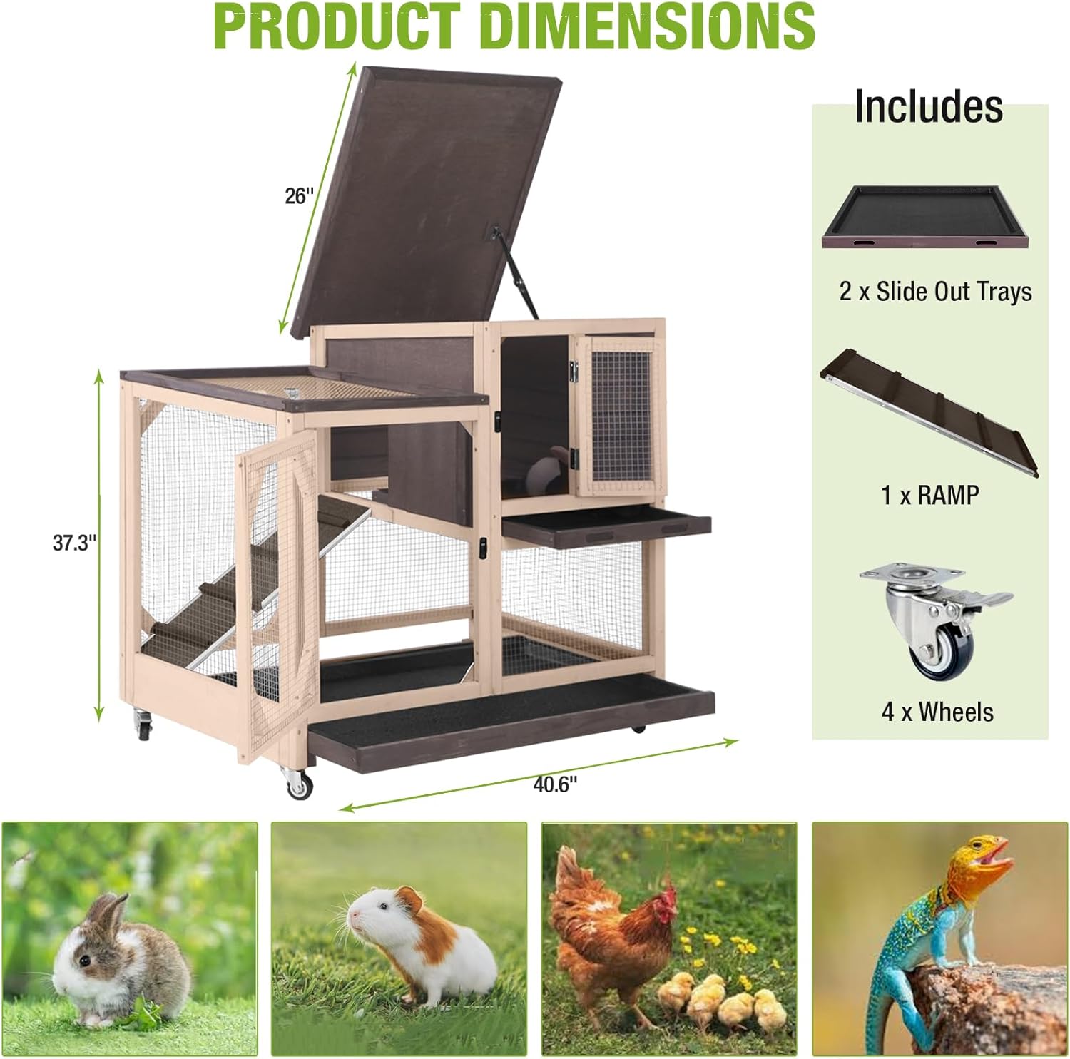 GUTINNEEN 2-Story Rabbit Hutch with Chew-Proof Ramp & Pull-Out Trays - Indoor/Outdoor 39.3" Wooden Rabbit Cage on Wheels for Rabbits, Guinea Pigs (Dark Brown)