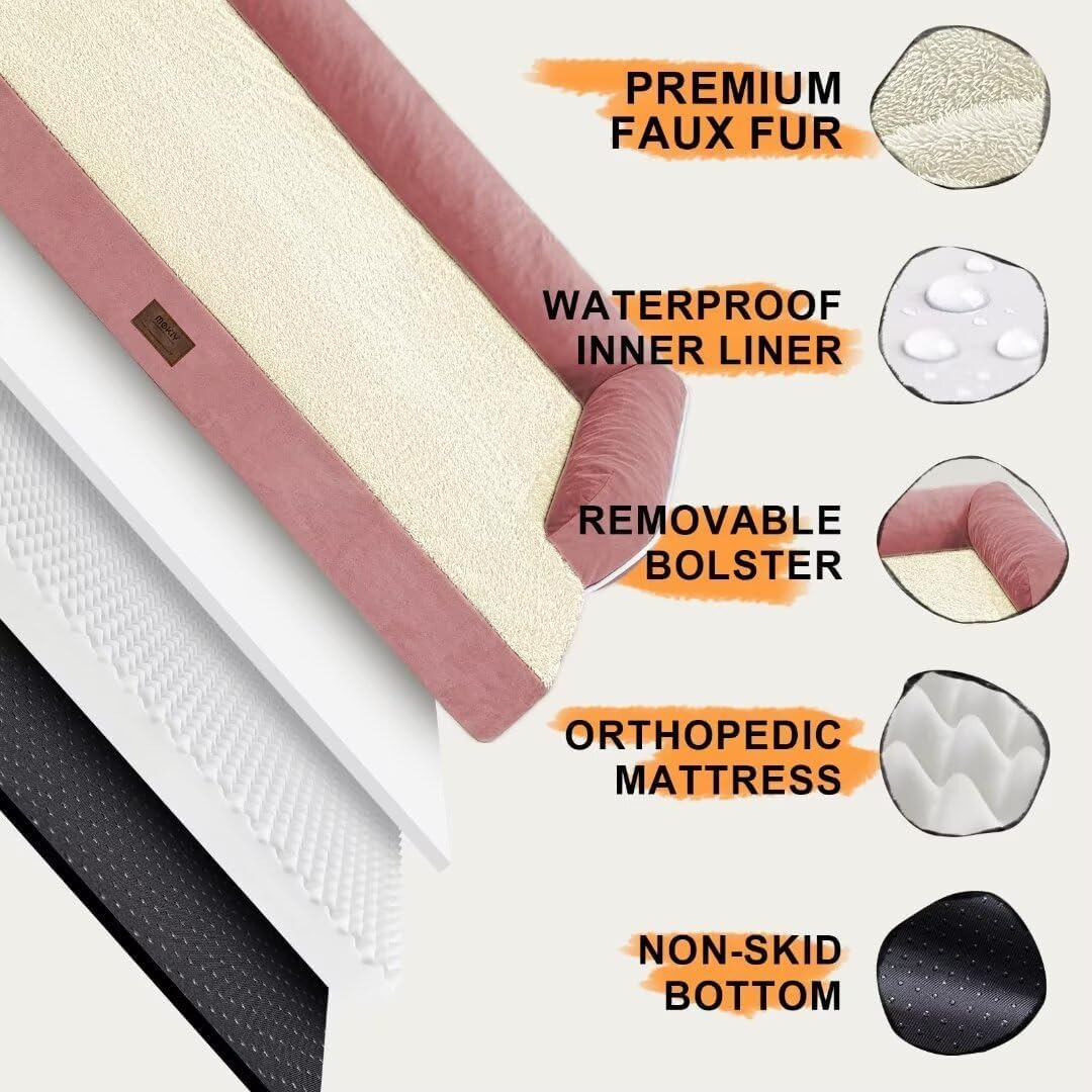 • Orthopedic Support: Mekiy orthopedic dog bed 3.5 inches bolster design can effectively soothes the pet's muscles; offering your pet a variety of cozy positions to snuggle; The cushioned bolster shape is fully filled to support your pet’s head and neck for a more restful sleep