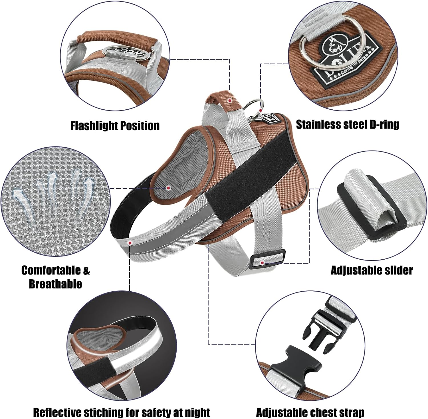 - STURDY HANDLE: The adjustable dog harness with rugged nylon handle further enhances your distance from the dog and is more intimate with each other. Easy on dog harness is also the best partner for dogs and is easy to control your dog.