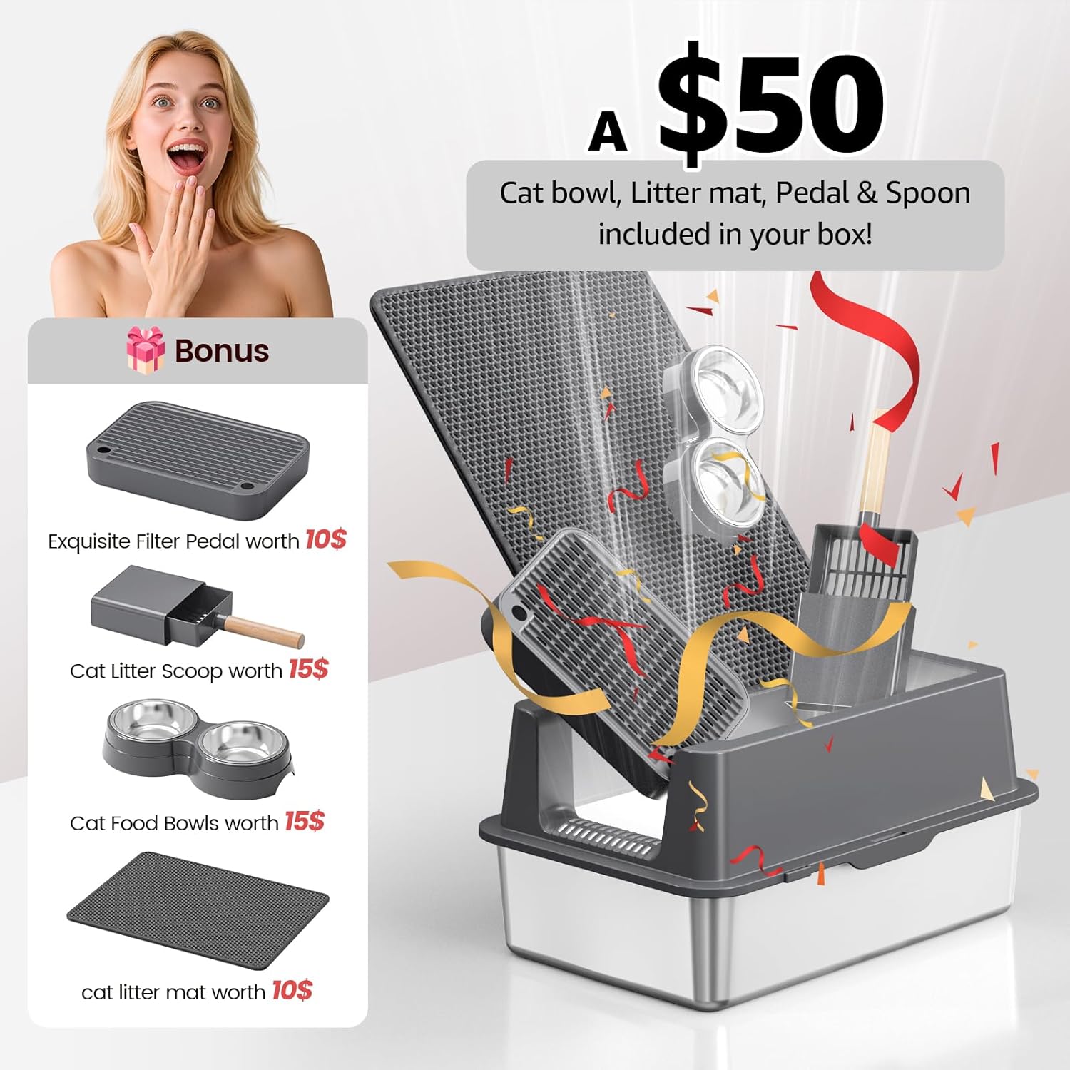 Stainless Steel Cat Litter Box - Enclosed XL Metal Kitty Litter Box with Lid for Big Cats, High Sided, Anti-Leakage, Easy Cleaning, Non-Sticky, Included Litter Mat, Cat Bowl & Spoon