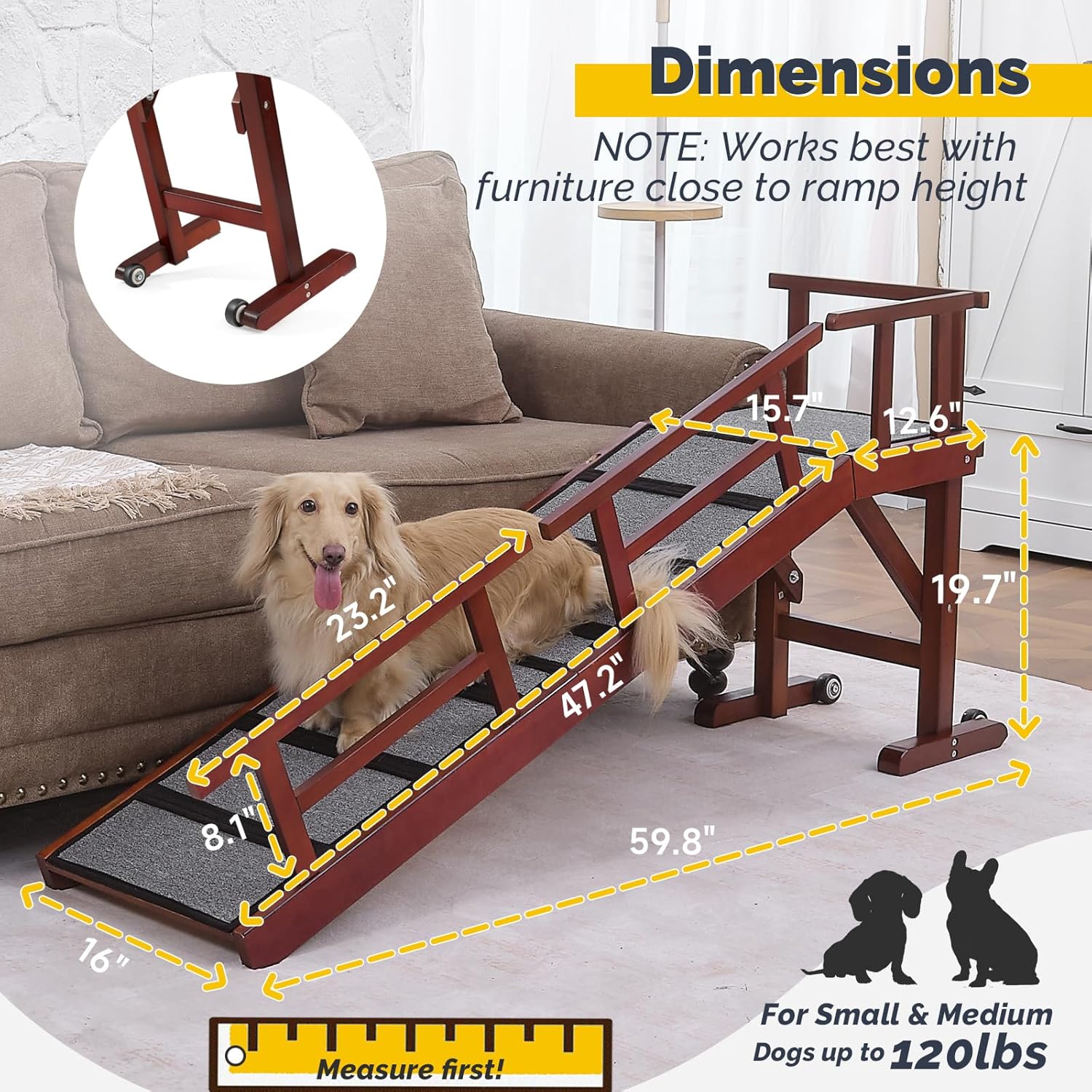 - PET RAMP FOR BED INFO: Measures 60" L × 16" W × 20" H without rails, and 28" H with safety rails. Ramp length: 47.2". Assembles in just a few simple steps.