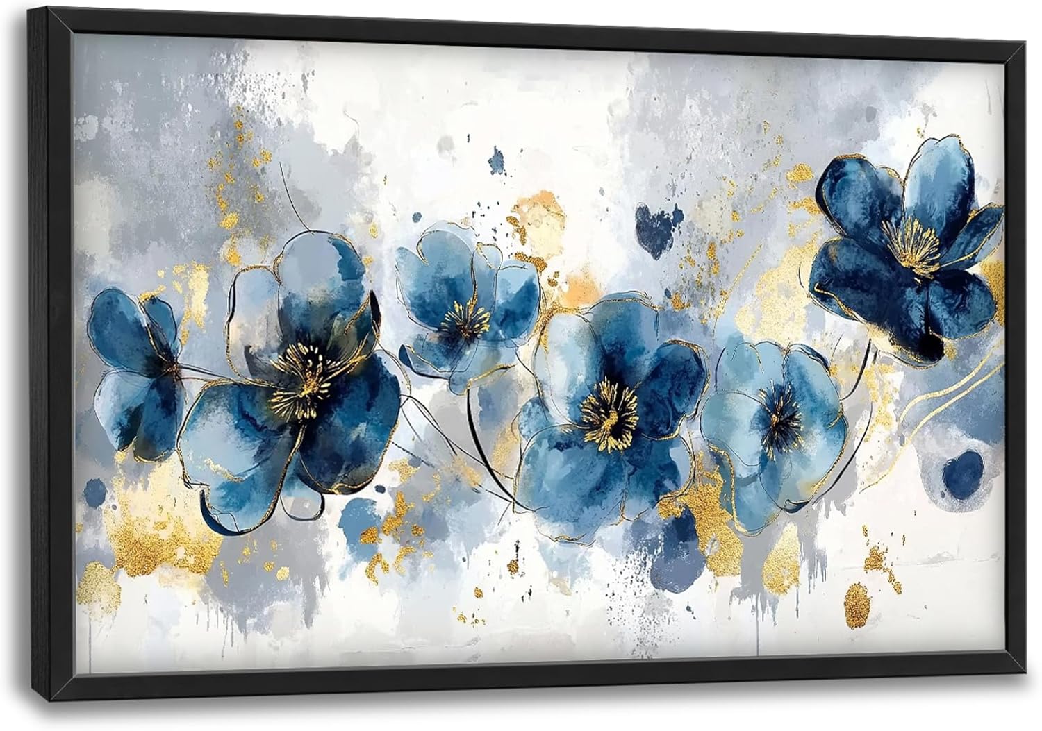 - 【Unique Design】 Abstract blue flowers with gold accents on a grey background, in the style of a watercolor painting. The artwork is elegant and sophisticated.