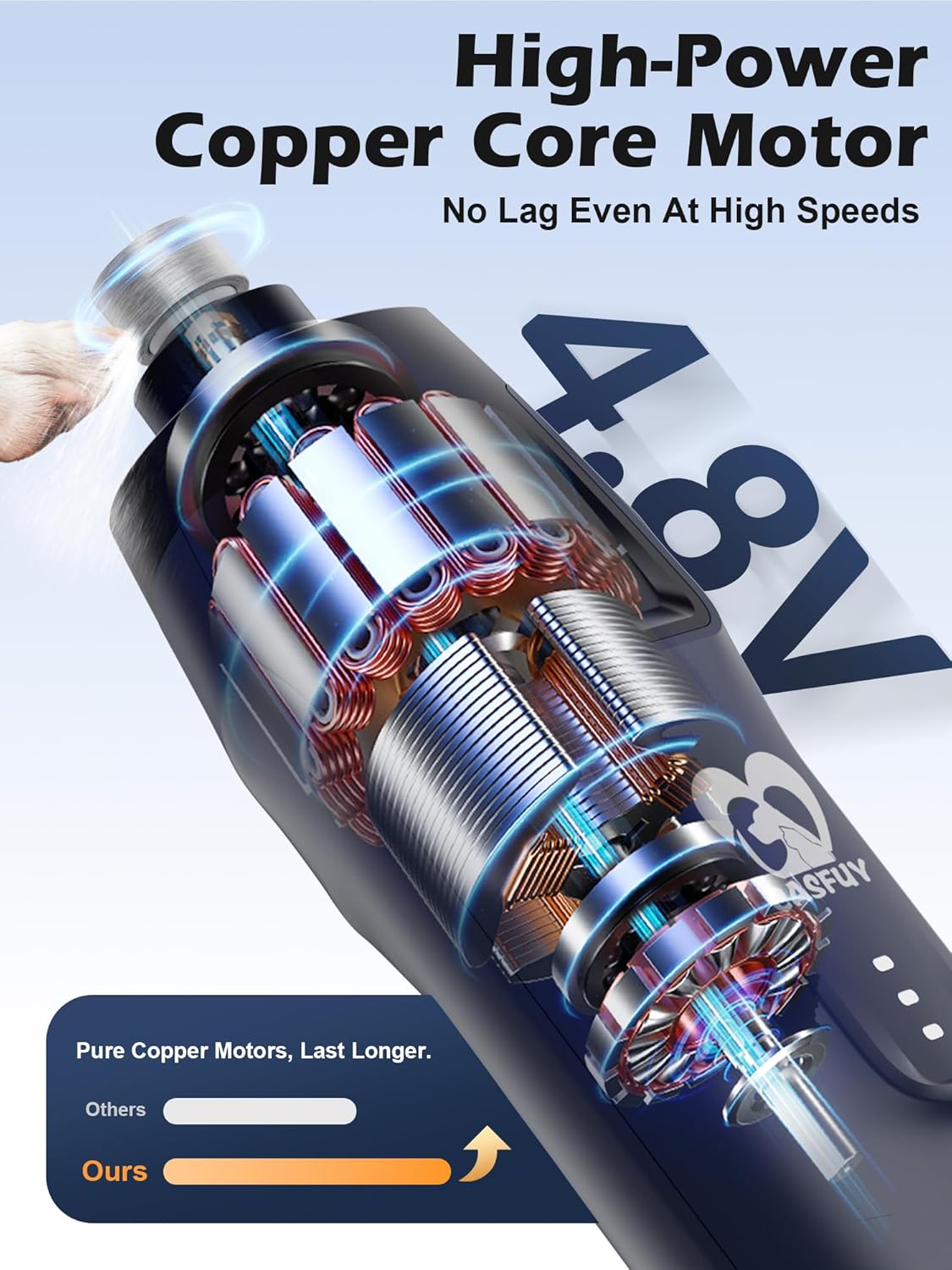• 【4.8V Copper Core Motor - No Lag, More Power】Enhanced with 50% more torque, our powerful dog nail trimmer easily handles thick, tough nails. The durable copper core delivers smooth, stable grinding for an effortless grooming experience—even at high speeds—without stalling or slowing down.