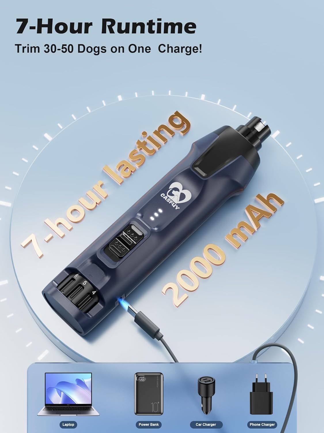 • 【7-Hour Runtime—Groom 30-50 Dogs】Powered by a 2000mAh lithium-ion battery, this nail drill for dogs delivers up to 7 hours of continuous use—even at max 12,000 RPM. That’s enough power to trim 30-50 dogs on a single charge! The universal Type-C charging (110V–220V) makes it perfect for home, salon, or travel use.