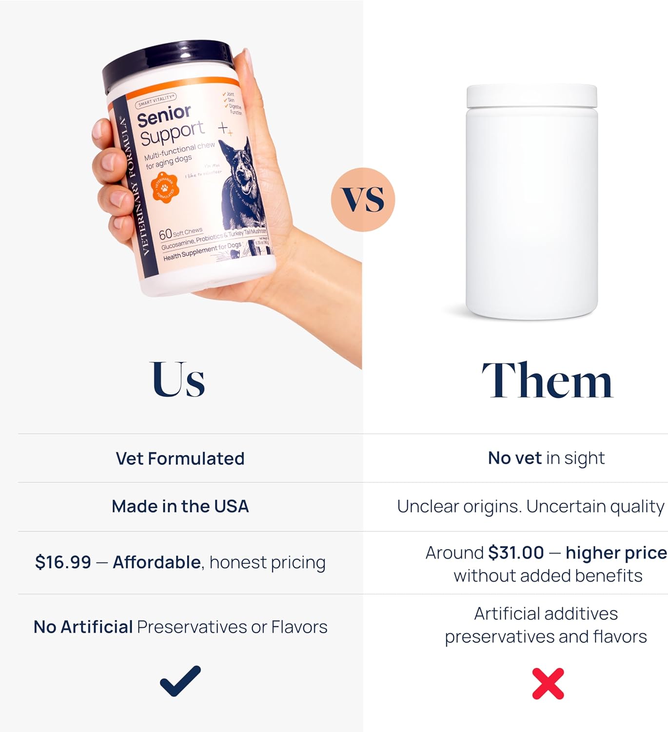 - VET-FORMULATED INGREDIENTS - Glucosamine and chondroitin help maintain joint health and flexibility. Probiotics and Turkey Tail Mushroom help support digestion and immune defenses. A smart senior dog supplement in trusted dog supplements & vitamins.