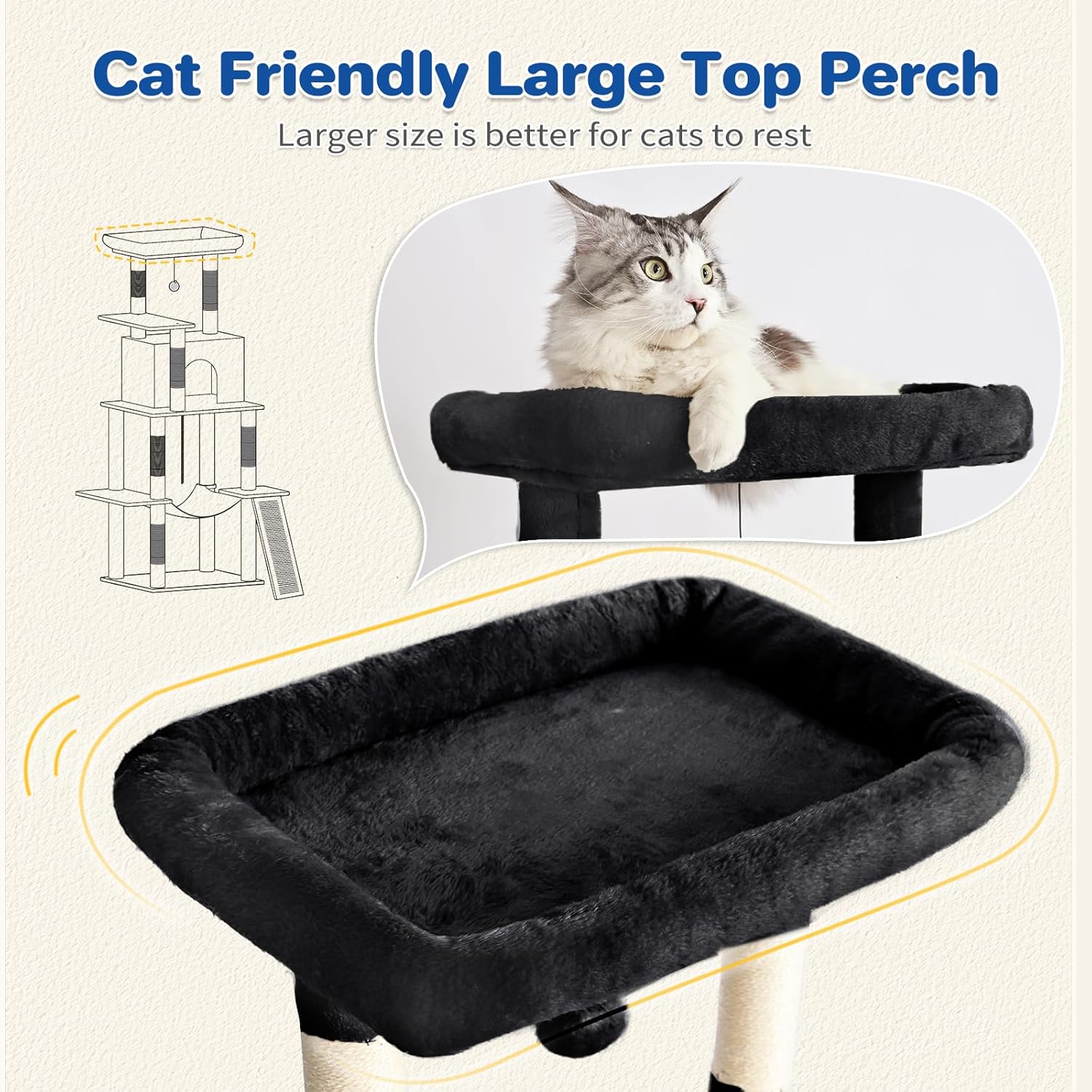 Cat Tree Tower 63in Multi-Level Cat Tower for Indoor Cats with Sisal Scratching Posts, Condo, Hammock, Dangling Ball and Extended Platform for Cats to Play, Black