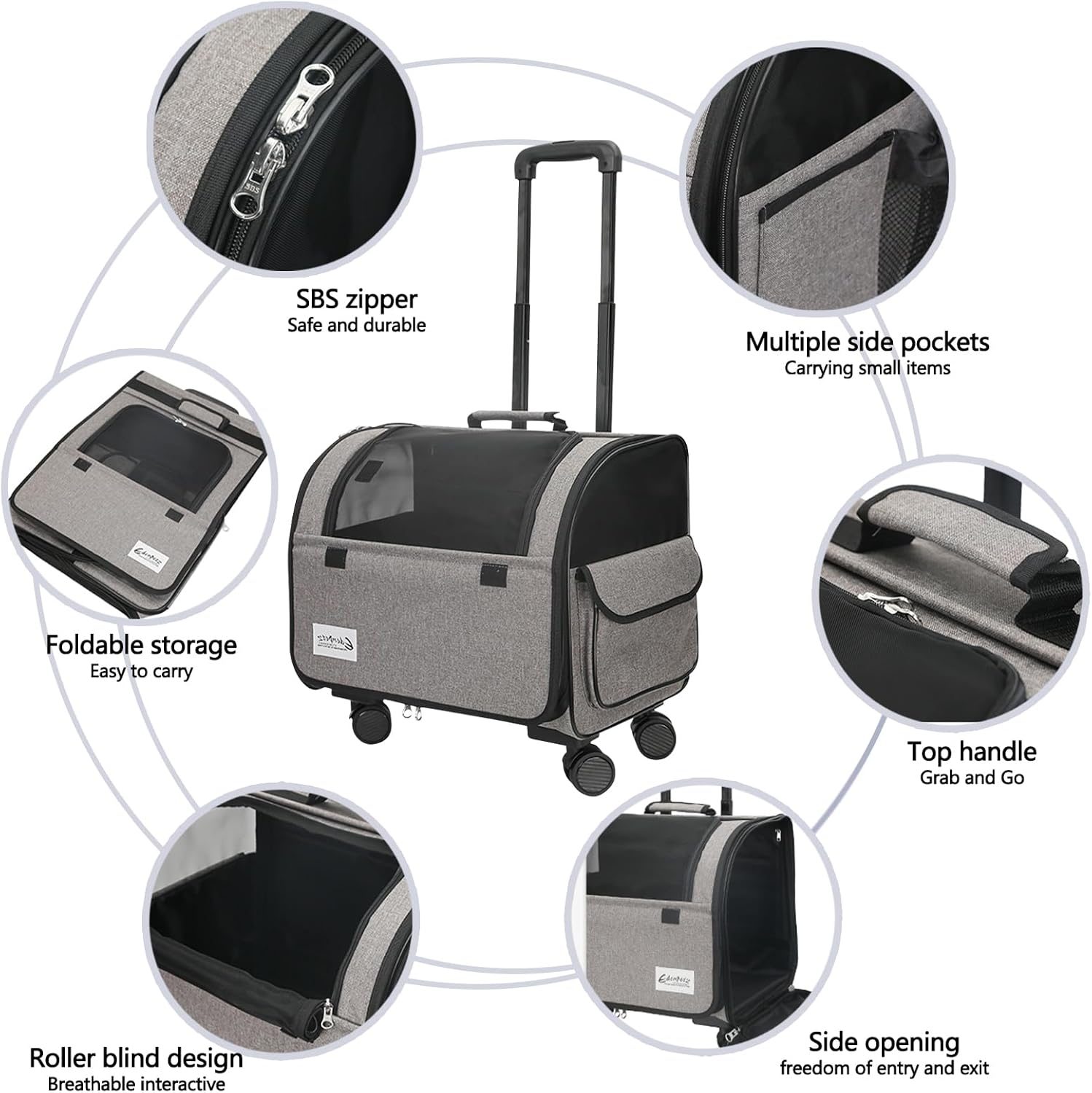 Dog Travel Bag with Removable Rolling Wheels, Airline Approved Pet Carrier, Foldable Cat Bag with Breathable Mesh, Pet Stroller(Grey)