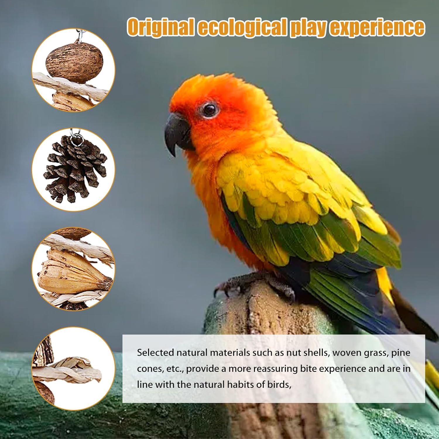 - 【Safe and Non-toxic Parrot Toys】 Handmade from pure natural materials, it contains pine cones, woven mats, starfruit, and other natural fruits. Parrot babies can chew them freely, making it the best choice for parrot toys