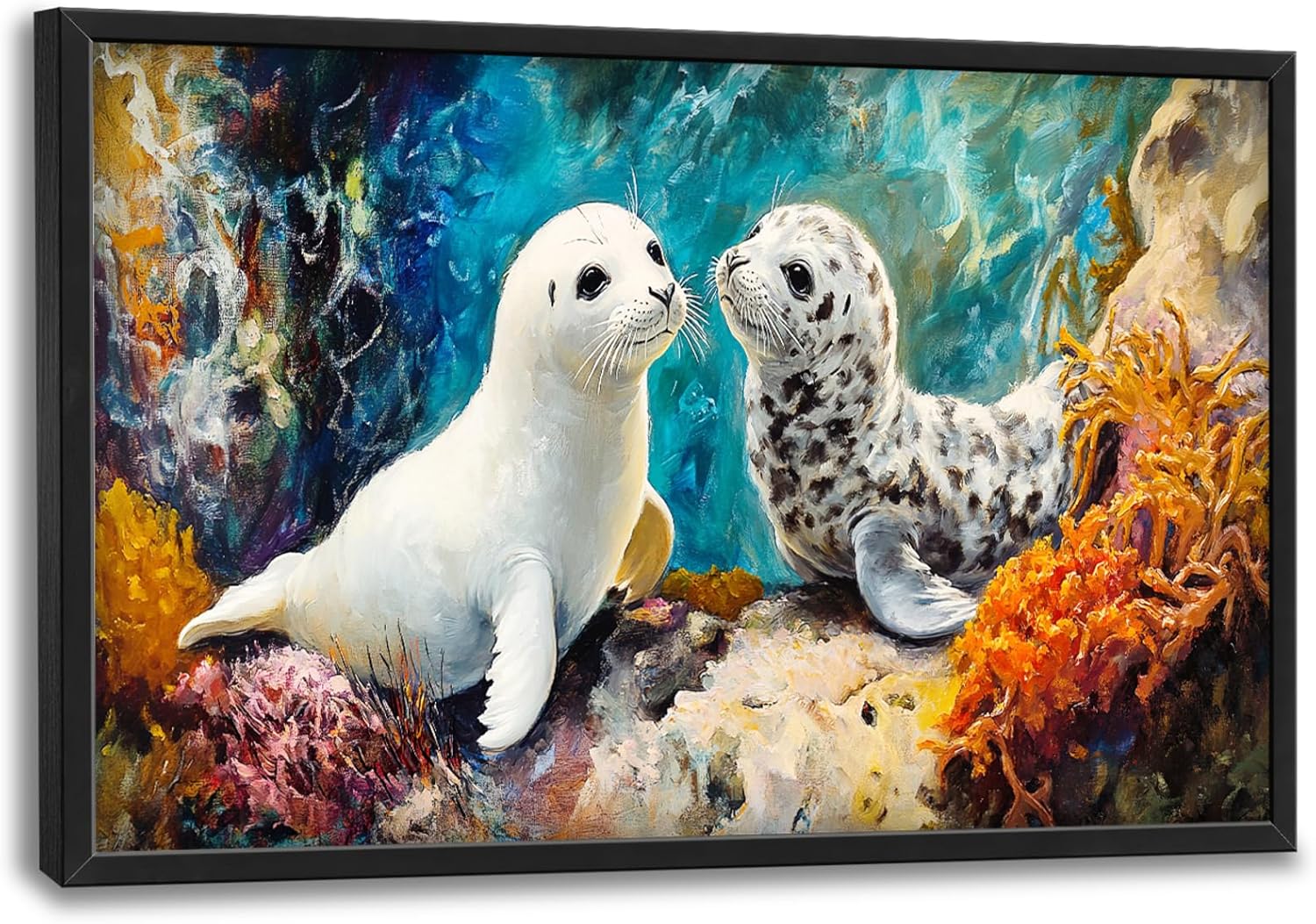 Extra Large Seal Framed Wall Art for Living Room,Oversized Underwater Animal Pictures Wall Decor,Ocean Coral Reef Canvas Print Painting Modern Artwork Bedroom Office Bathroom 36L" x 24W"