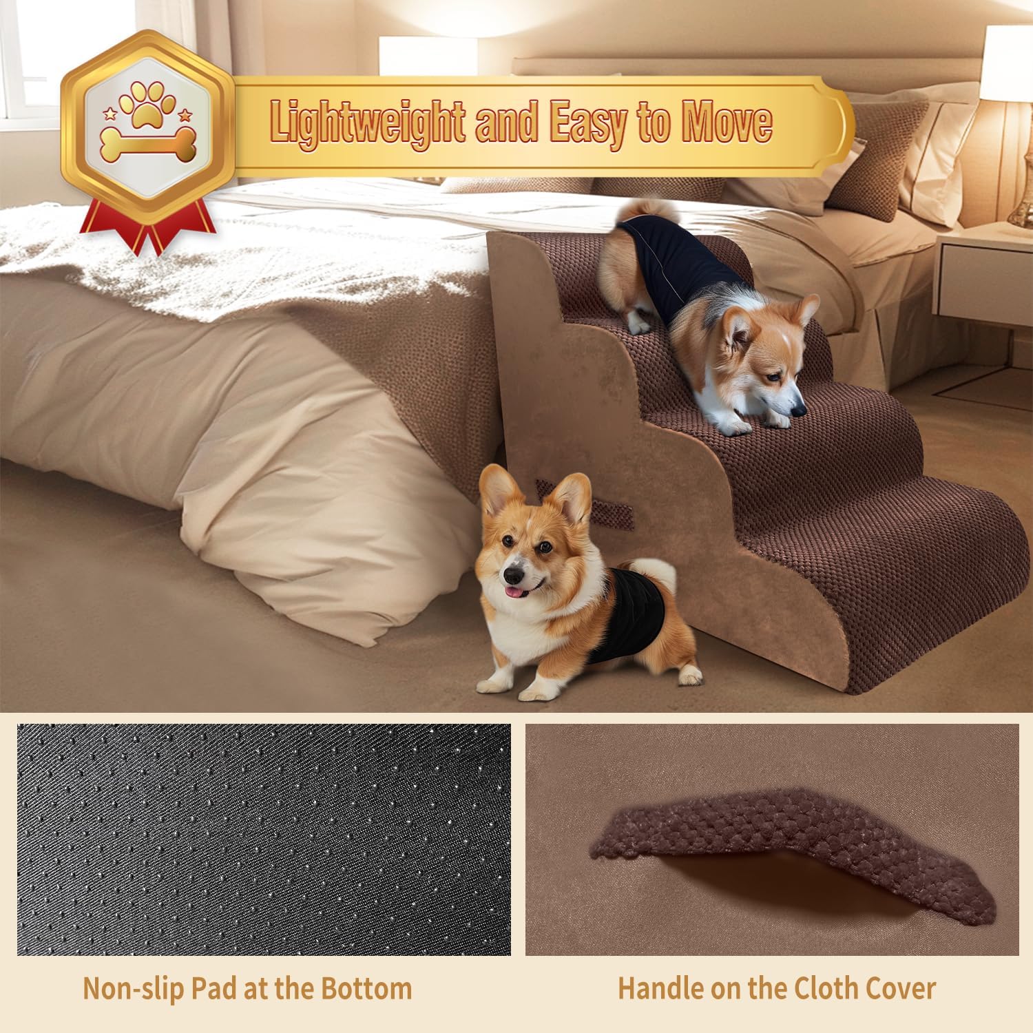 PAWSCART Dog Stairs for Small Dogs and Cats, 4-Step Dog Steps for Bed, 19.6" H Pet Stairs for High Bed, Pet Ramp for Couch, Sofa, Non-Slip Surface Removable Washable Cover, Brown