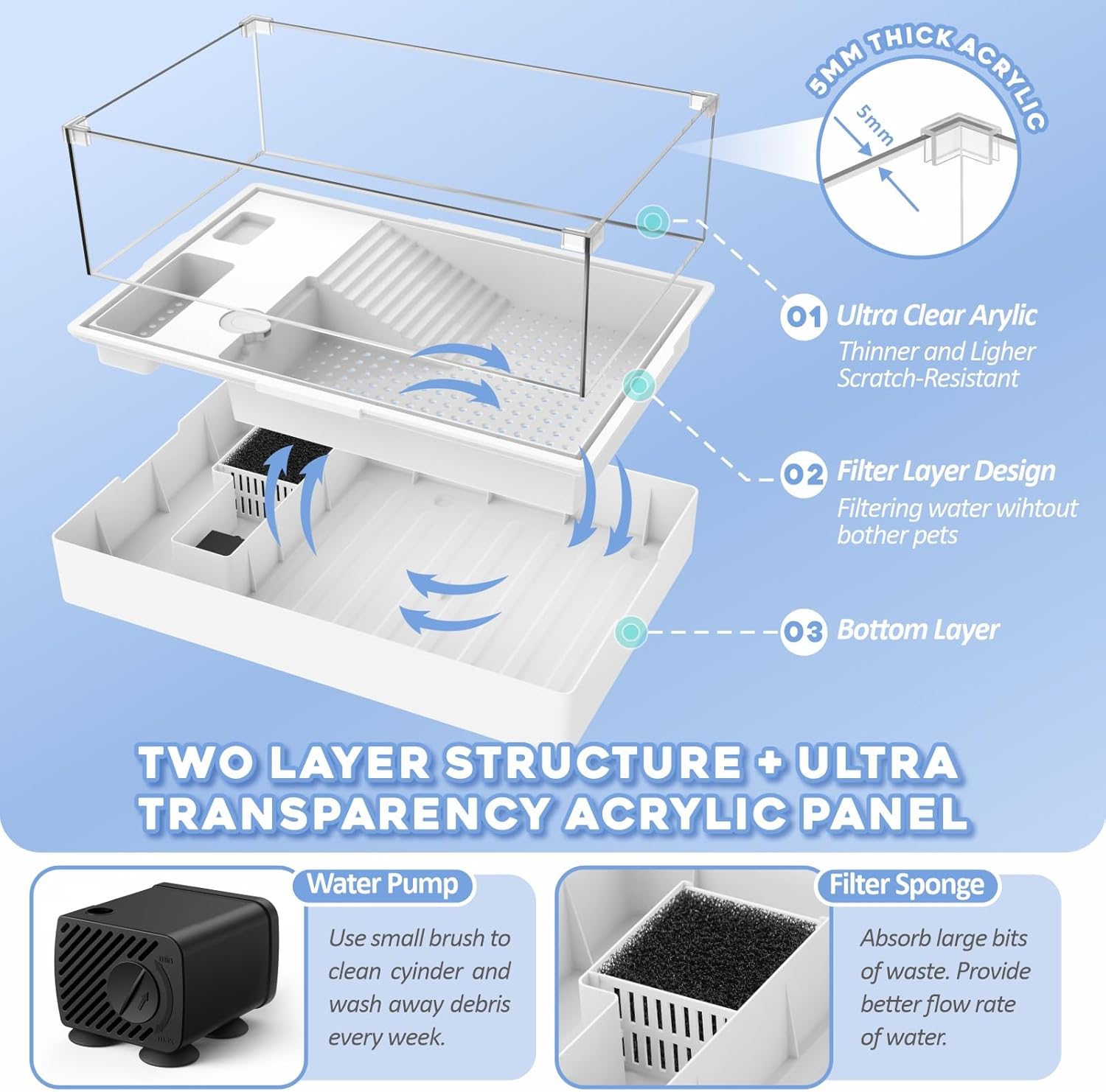 - ăTWO-LAYER DESIGN - EASY TO CHANGE WATERăTurtle tank base is a 2-layer separated design. Lift the first layer, food residue and excretion will sink into the bottom layer, then you can pour out all watse in the bottom layer and add fresh water; Save your time and trouble to drainage from a tiny hole slowly. During the process, your pet and other decorations in the tank just need to stay put and remain undisturbed. Note: Water should be refreshed 1-2 times per week, even with water pump.
