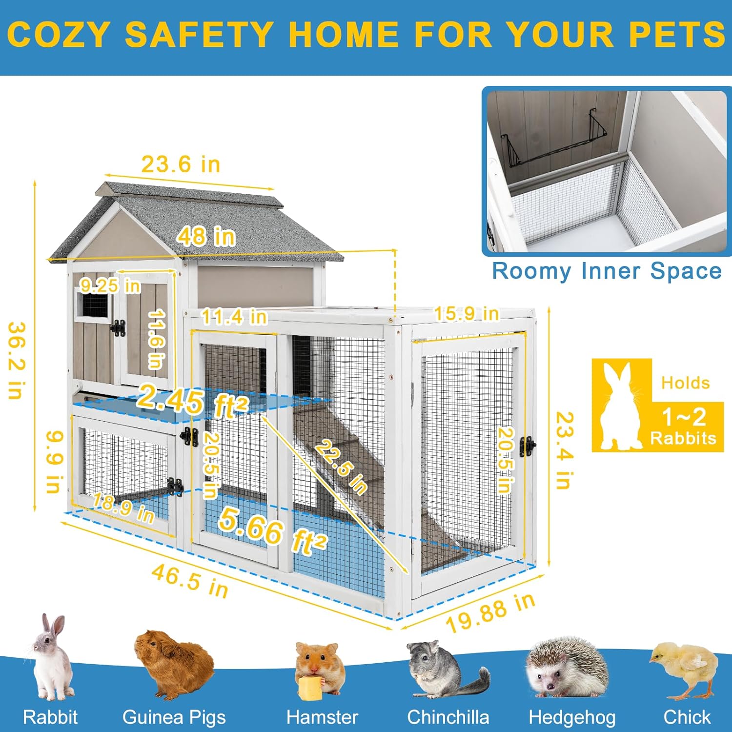 - 【2-STORY DESIGN FOR REST AND PLAY】Includes a cozy upper penthouse (2.45 ft²) and a spacious lower activity zone (5.66 ft²), connected by a chew-resistant ramp. Great for 1–3 rabbits or other small animals to lounge, climb, and explore.