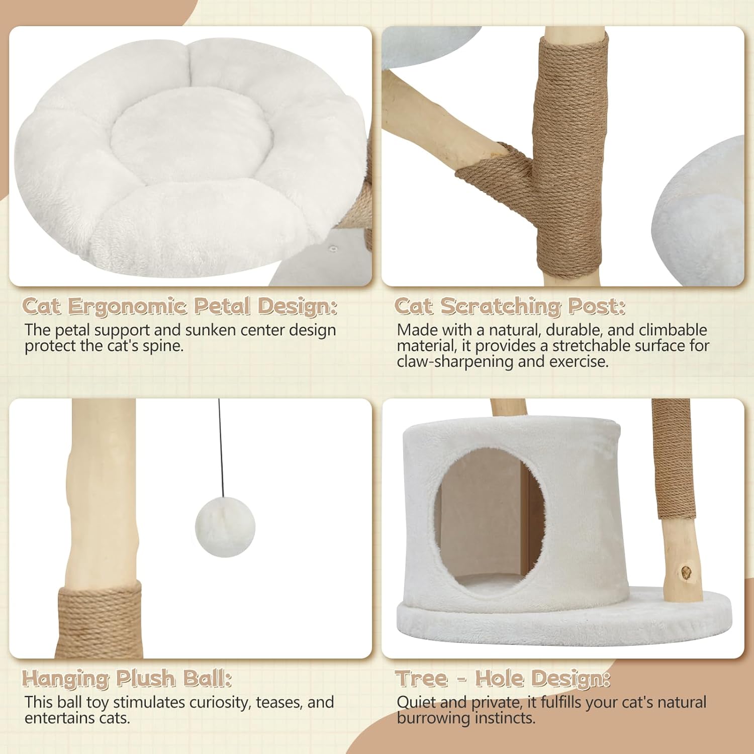 - Adorable Appearance & Versatile Use: A luxurious modern cat tree tower elevates your home decor. The flower-shaped platforms and elegant Y-shaped supporting posts make it a decorative addition to any room. Each platform is thoughtfully spaced and sized, allowing your cat to climb, jump, play, hide, relax, or sleep.