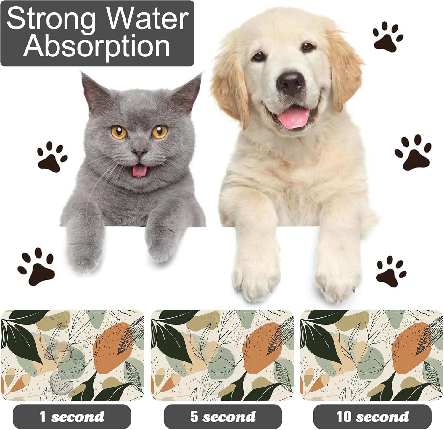 - Super Absorbent & Stain-Resistant:Made with ultra-absorbent fabric, this pet feeding mat quickly soaks up water, milk, or food spills, keeping the area around bowls clean and dry. Say goodbye to wet paw prints and sticky residues—perfect for messy eaters and playful drinkers.