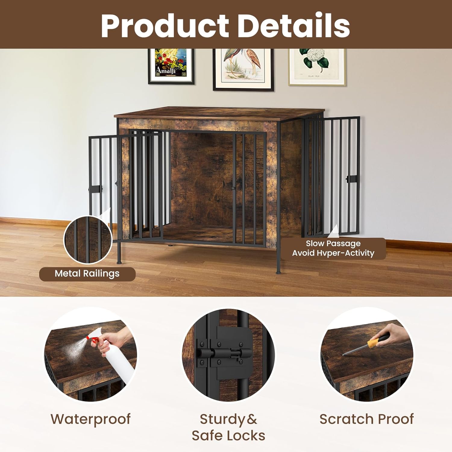 - Upgraded Wood-Steel Frame: 0.5-inch thick steel tubes and panels, plus an added support bar under the floor, build a sturdy dog kennel indoor that resists chewing and wobble. Smooth surfaces wipe clean of drool or muddy paw prints, keeping the crate looking sharp through years of zoomies and naps.
