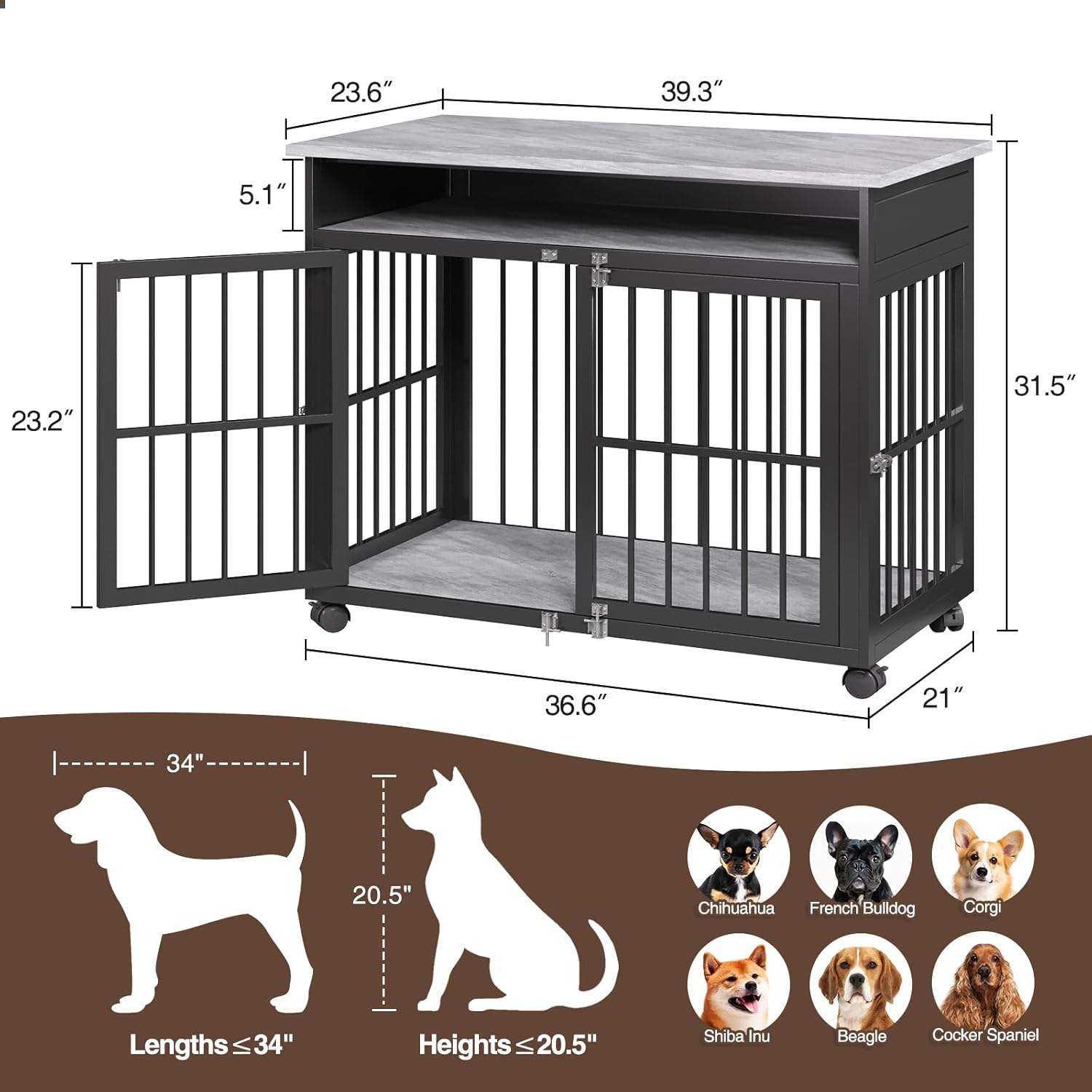 39.4" Dog Crate Furniture for Medium and Large Breed, Dog Kennel Furniture with Storage Shelf & Lockable Wheels, Heavy Duty Wooden End Side Table Pet Cage Indoor, Chew-Resistant, Grey