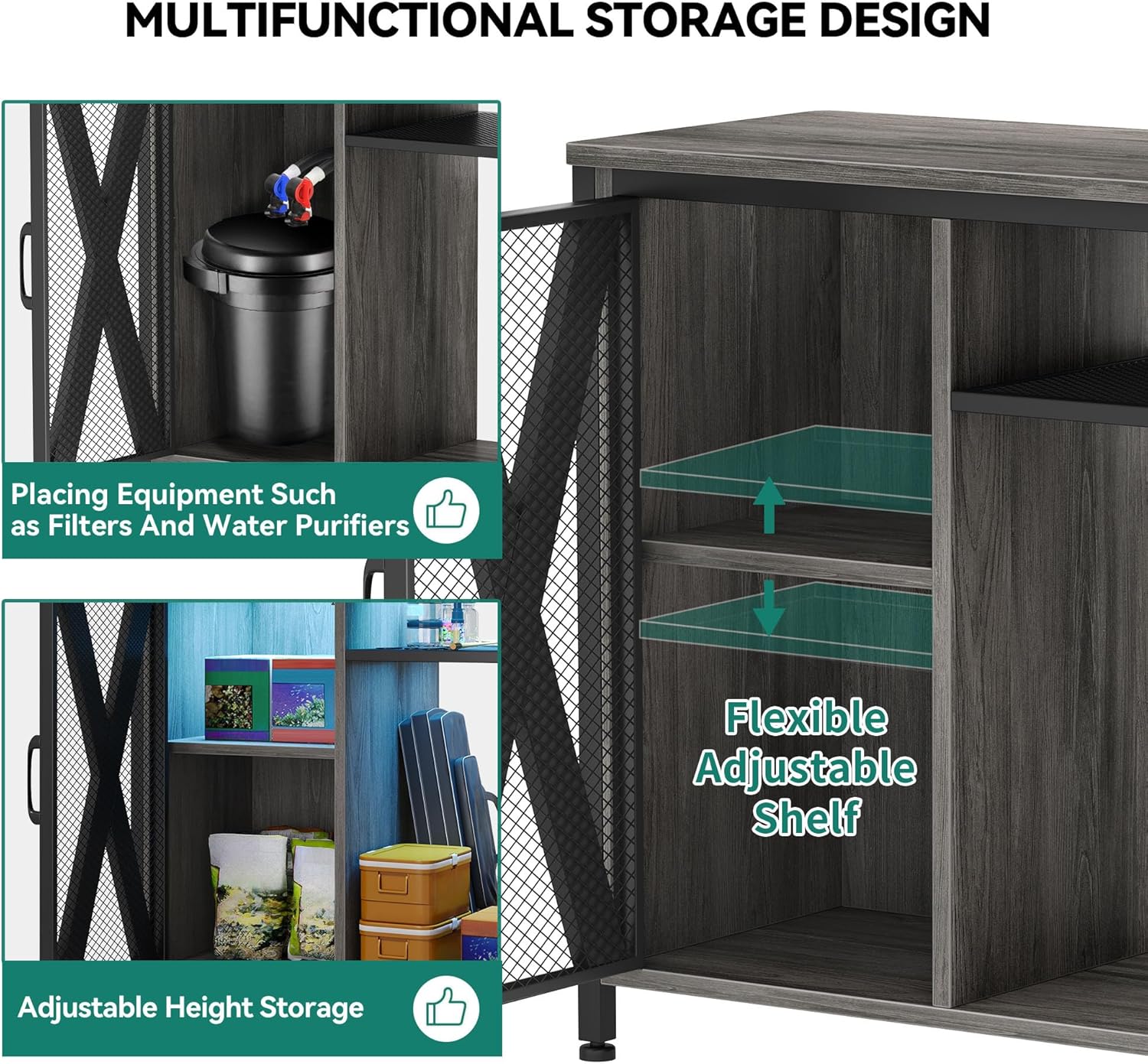 - Storage Efficiency: Maintain order with our fish tank with stand features for fish food, tools, and accessories. Adjustable shelves cater to items of all sizes, keeping your aquarium essentials in one place