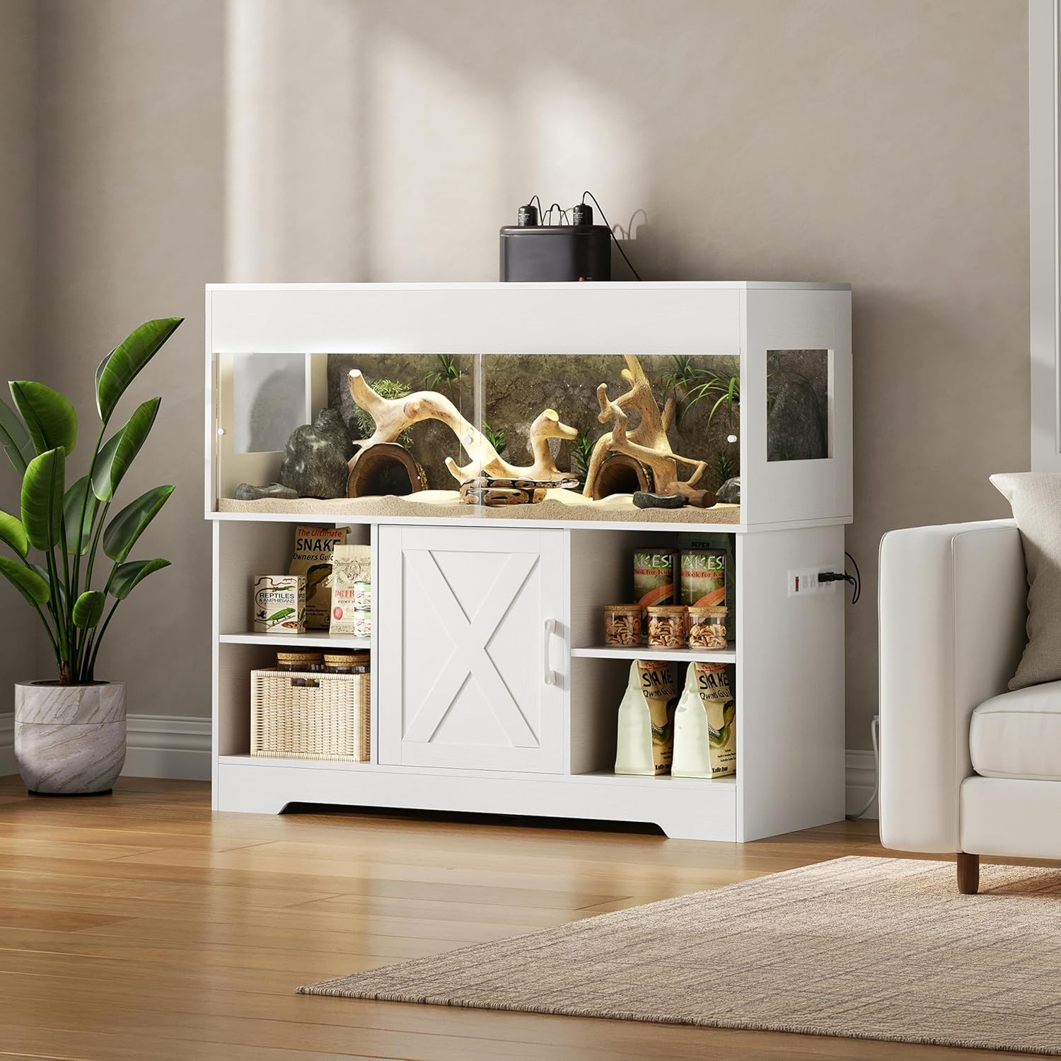 - All-in-One Storage Base â More than just a vivarium tank, this design includes a full base cabinet with dual side compartments and a center door cabinet. Easily store all your reptile care essentialsâUVB lamps, heating mats, thermometers, substrate, snacks, and toolsâin one organized space.