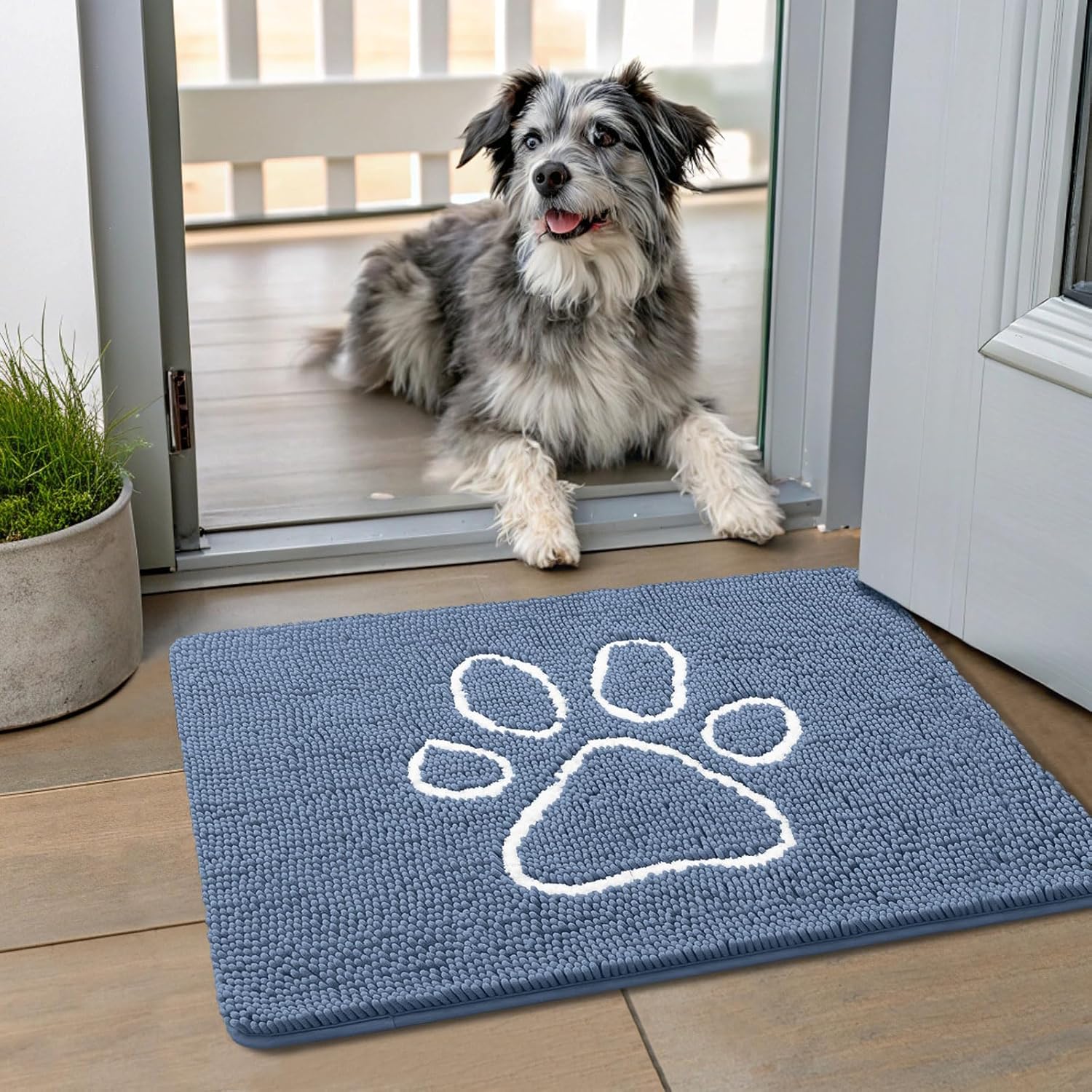 Smiry Dog Door Mat for Muddy Paws, Absorbent Dirt Trapper Non Slip Quick Dry Washable Chenille Mat for Mud Dogs, Entry Rug for Indoor and Outdoor (24x16 Inches, Airy Blue and White)