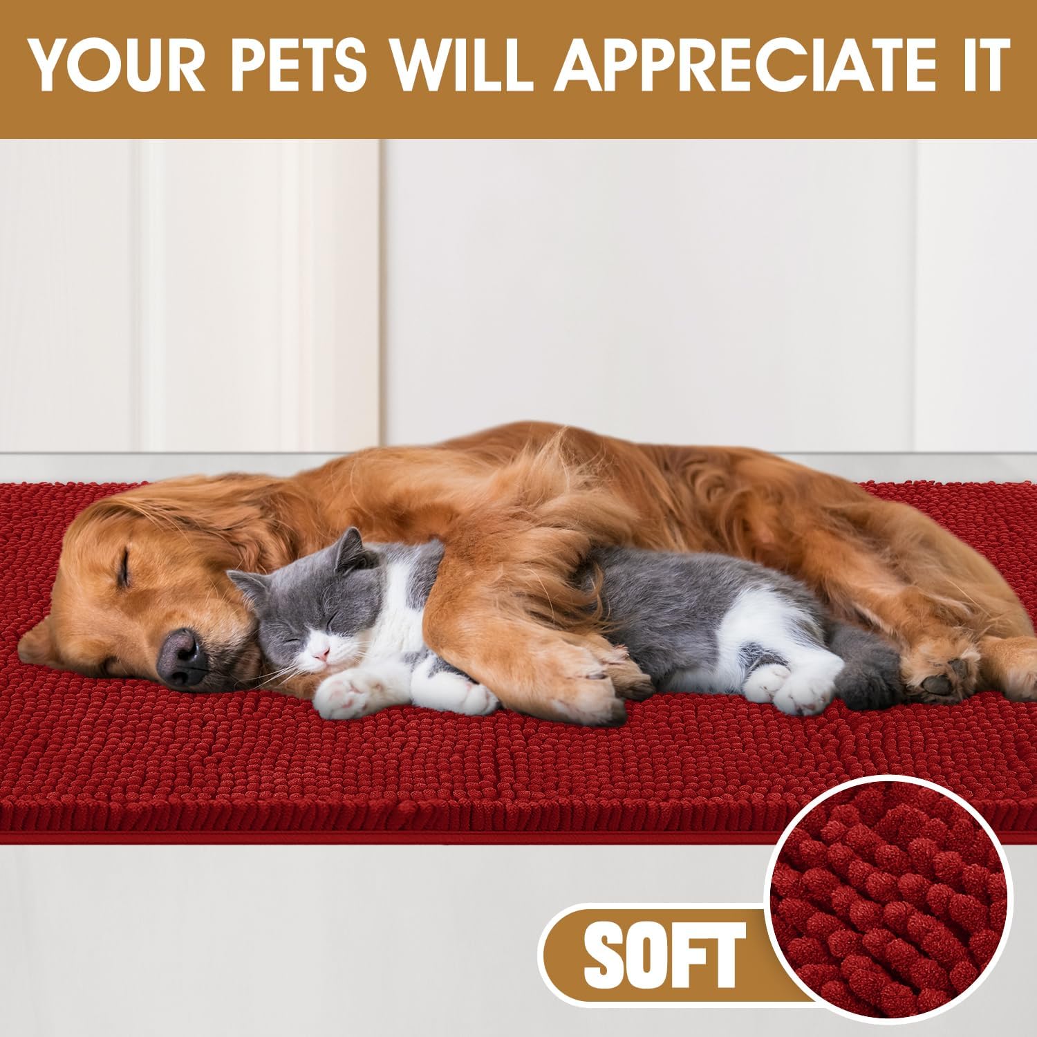 Dog Door Mats for Muddy Paws, Chenille Absorbent Door Mats, Non Slip Heavy Mud Mat for Dogs, Soft Indoor Door Mat for Entryway, Mud Paws, Inside Floor,30" X 20", Red