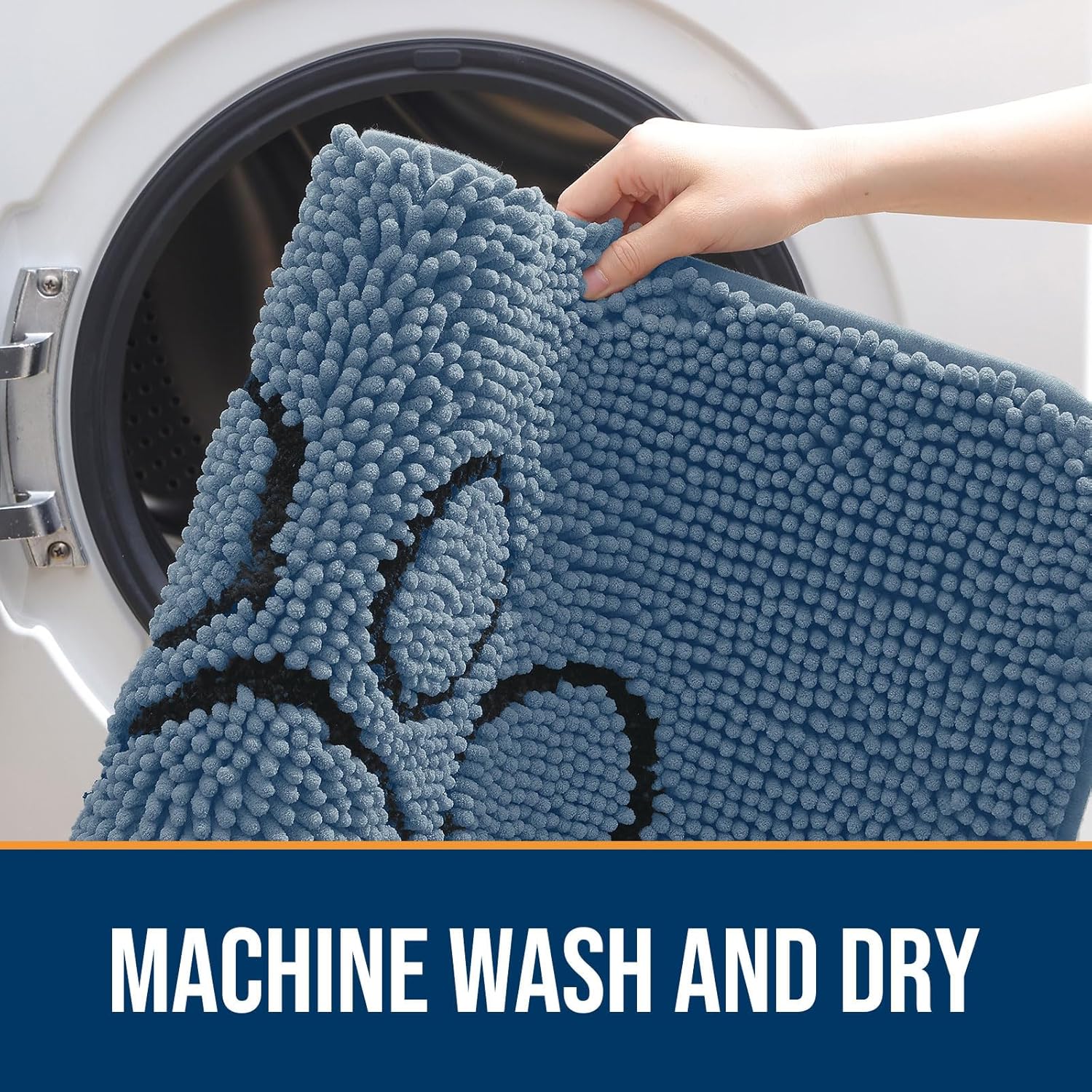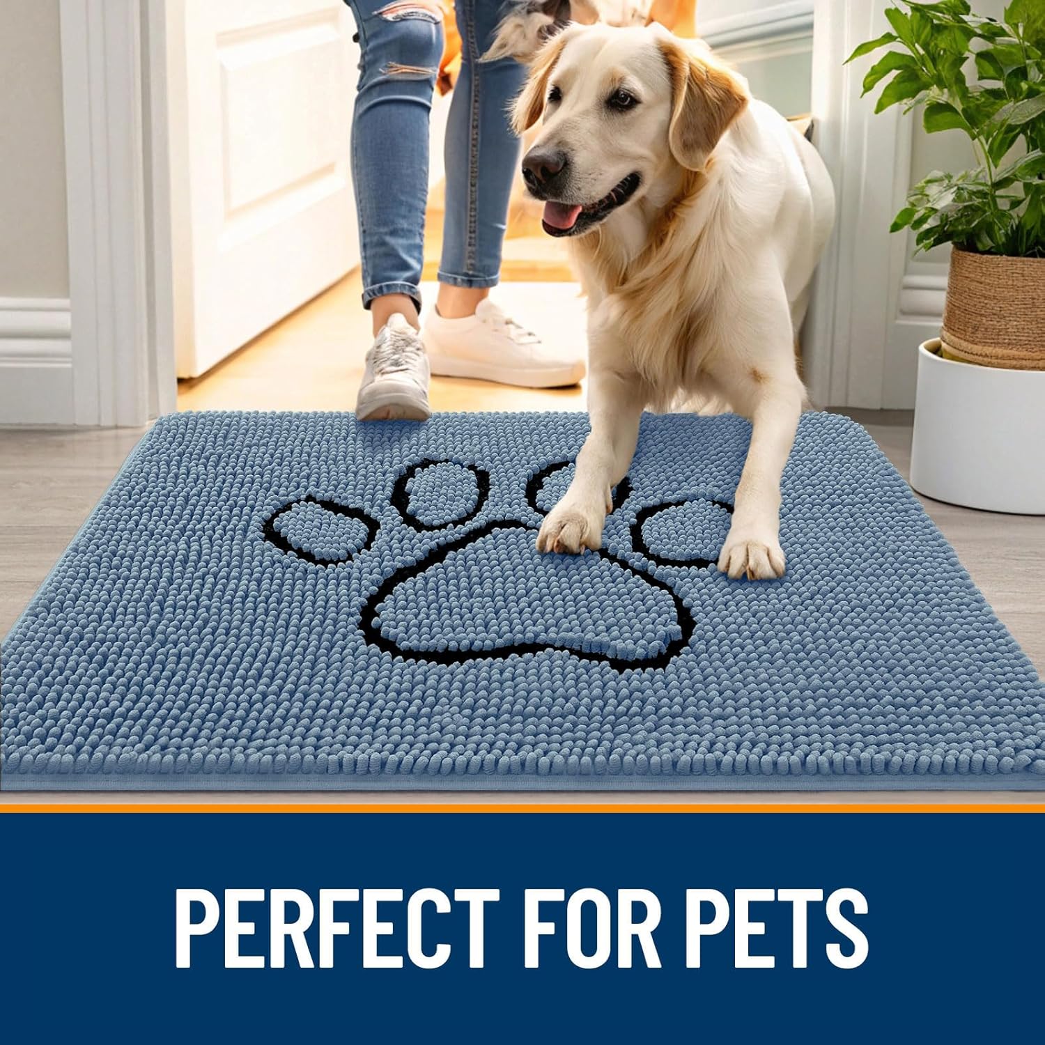 OLANLY Door Mat for Muddy Dog Paws 48x30, Absorbent Chenille Doormat with Paw Print Design, Non-Slip Washable Doormat for Indoor Entryway, Quick-Dry Pet Bed Mats for Dirty Dogs, Airy Blue and Black