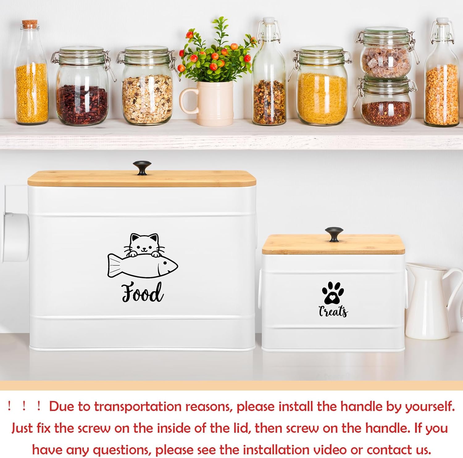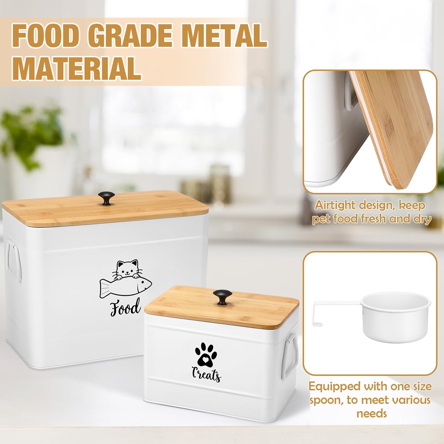 Extra Large Metal Cat Food Containers Airtight 12+3.5 lbs Cat Treat Snack Jars Set of 2 with Bamboo Lids and Spoons Farmhouse Big Pet Cookie Storage Jars for Kitchen Counter Gifts(White)