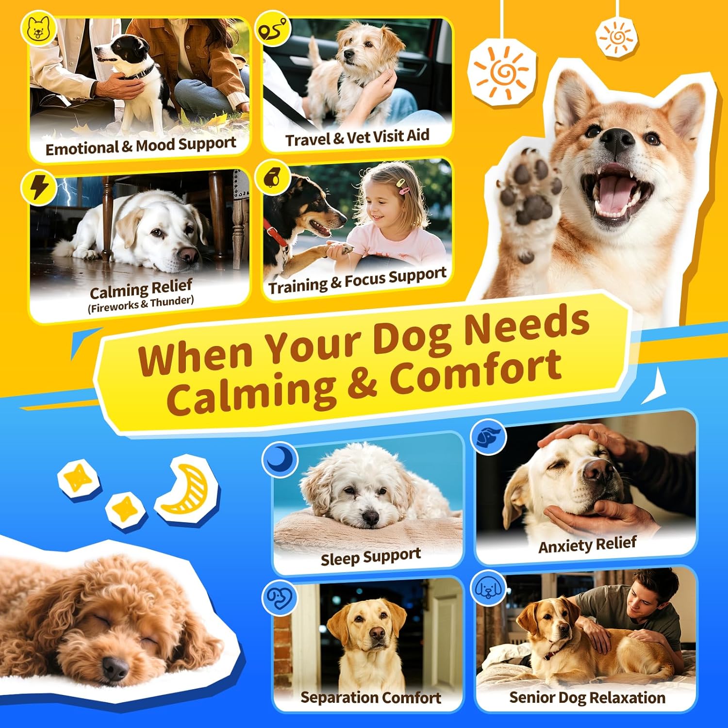 - Day & Night Calming Treats for Dogs: POPPAW’s Day & Night Calming Aid Set offers anxiety relief for dogs around the clock. The daytime dog calming formula helps soothe stress during thunderstorms, vet visits, or separation, while the nighttime blend, featuring melatonin for dogs, promotes deep, restful sleep. Perfect for loud noises, travel, or bedtime, this set keeps your pup relaxed and content.
