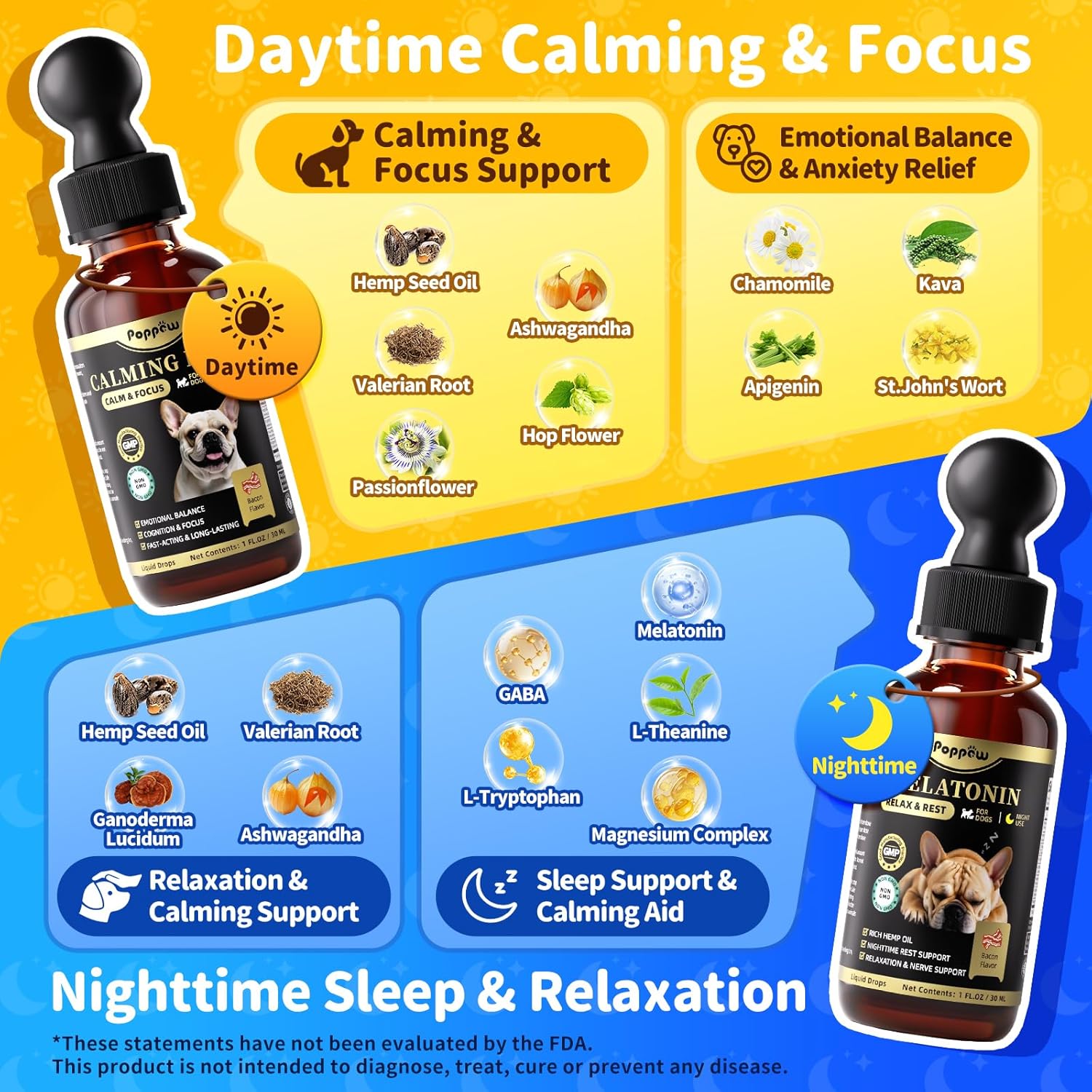 - Hemp & Melatonin Dog Wellness: POPPAW’s daytime calming treats for dogs feature Hemp Seed Oil for skin and joint health, while the nighttime formula uses melatonin for dogs to regulate sleep cycles. Together, they provide complete anxiety relief for dogs, keeping them calm by day and rested by night.