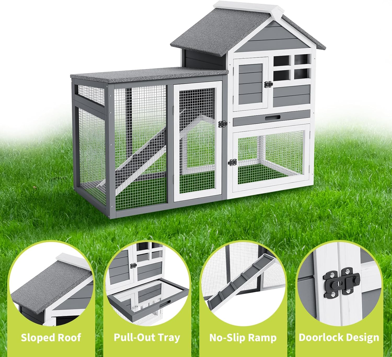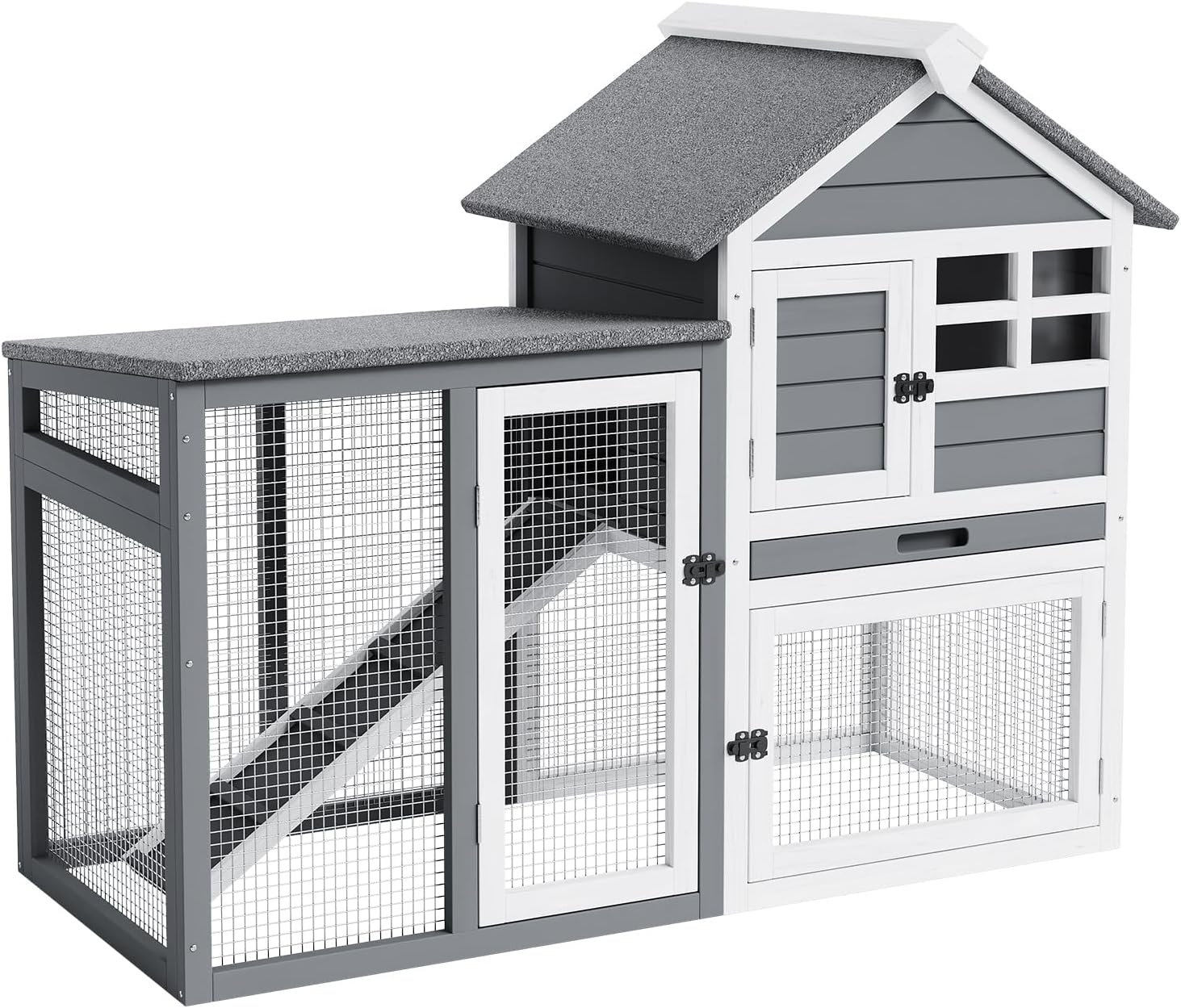 - [Comfortable And Safe] This Double-Decker Small Animal Hutch Features Thoughtful Details, Including A Textured, Non-Slip Ramp To Prevent Falls, Rounded Corners To Reduce The Risk Of Injury, And A High Ceiling That Supports Natural Movement. The Reinforced Wood Frame Is Chew-Resistant, Making This Indoor/Outdoor Pet Hutch A Durable Habitat.