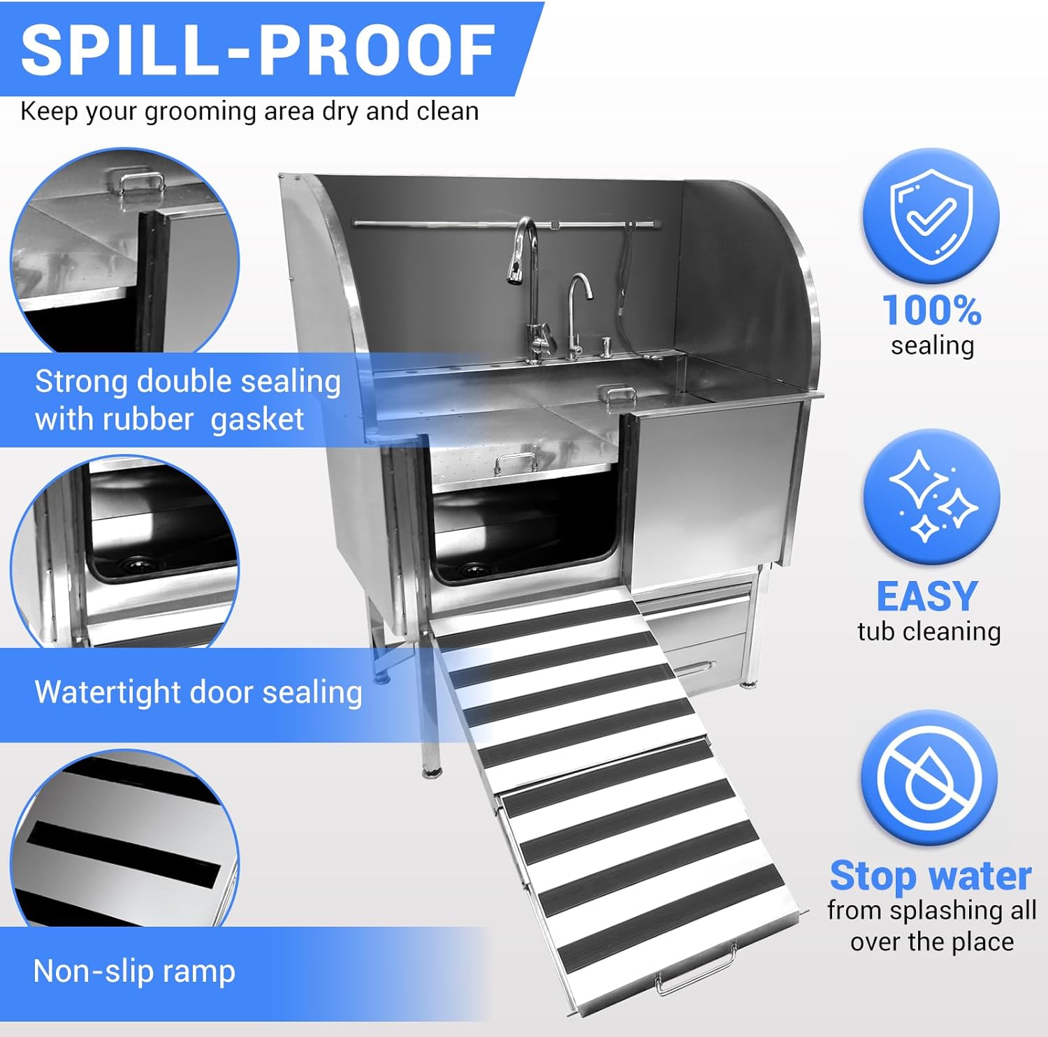 - Spacious Tub with Smart Storage: 62βx30.7βx58.7β size fits all dog breeds. Includes a large sliding drawer to organize towels, shampoos, and grooming tools for a clutter-free bathing area.