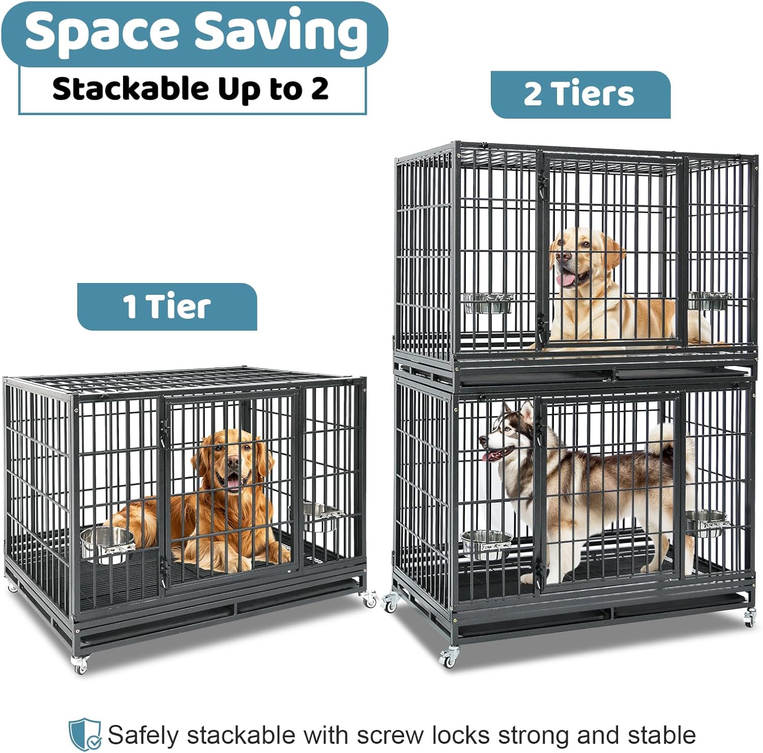 - Stackable to Save Space: The 48 inch heavy duty dog kennel stacks up to 2 tiers with secure screw-locksāideal for breeders, groomers, boarding facilities, and multi-dog homes