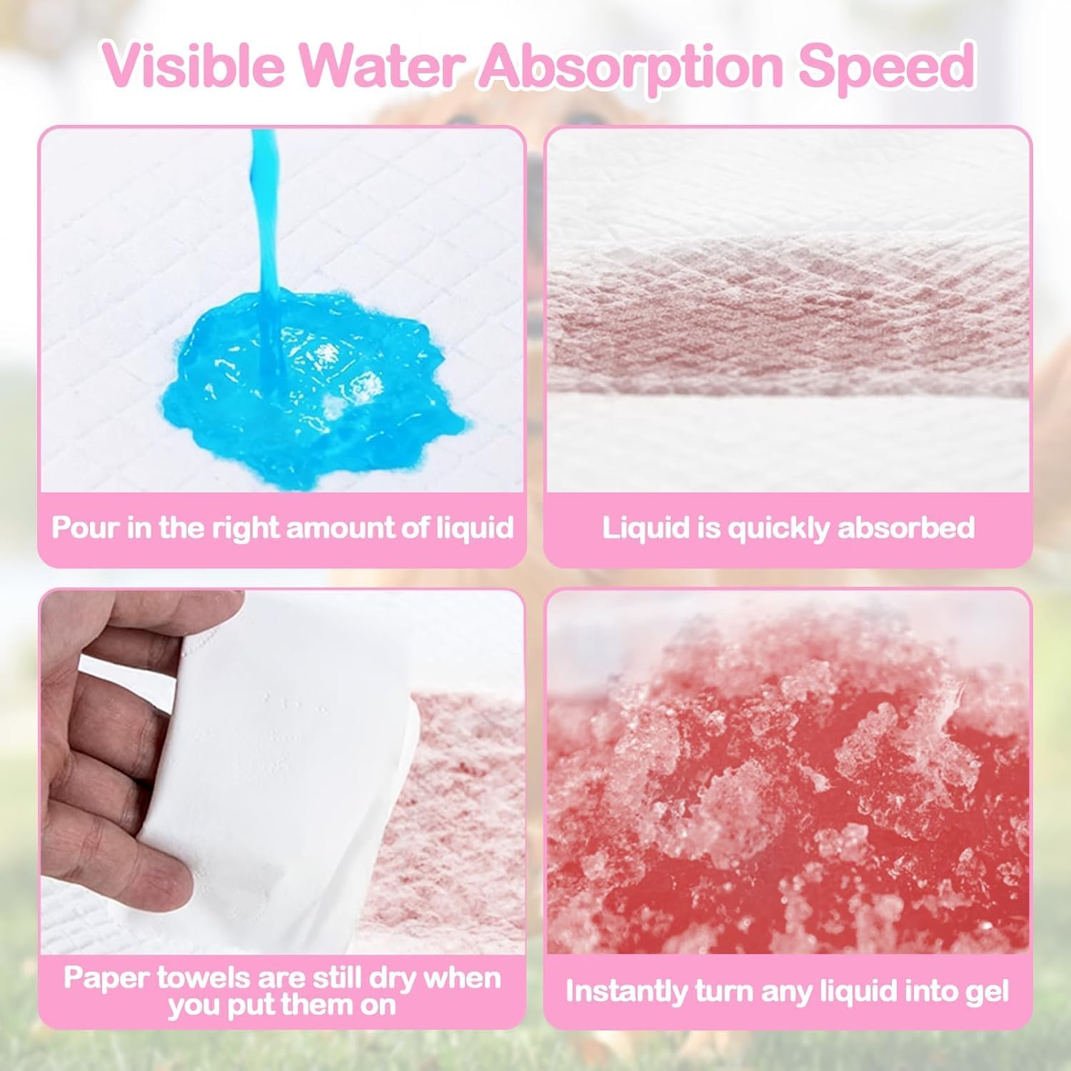 - 🌫【Quick-Drying Technology】 With a super-absorbent core and quick-dry surface, these pads prevent tracking, liquid overflow, and bad odors. Unique flash-dry technology quickly turns liquid into gel, preventing tracking, liquid overflow, and bad smell, making them suitable for all-day use without discomfort.non-woven fabric top layer of training pads is for fast absorbency, which absorbs liquid instantly and prevents overflow.